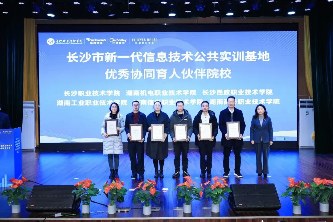 大会特设长沙市新一代信息技术公共实训基地颁奖仪式,旨在表彰各高校在推动开源鸿蒙技术进入校园、创新人才培养模式方面的先行实践。湖南湘江新区民政和社会保障局党组成员、副局长唐南沙为在产教融合工作中做出突出贡献的十所高校代表颁发了荣誉证书。这一仪式不仅彰显了政校企多方协同、共育人才的合作成果,更为后续更深层次的产教融合奠定了坚实基础。图/长沙市新一代信息技术公共实训基地优秀协同育人伙伴院校