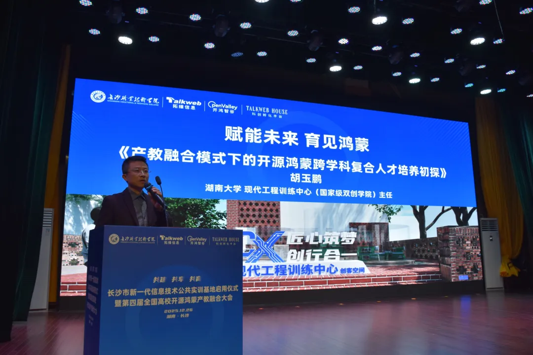 此次启用的公共实训基地,是在拓维信息及旗下开鸿智谷的牵头推动下,联合政府、高校及产业伙伴共同打造的标志性成果。各方不仅共同参与基地的规划与建设,更基于产业实践与教育需求的深度融合,将以“鸿蒙×AI”为代表的先进技术积淀转化为系统化的课程体系与解决方案。在大会发布环节,开鸿智谷联合生态伙伴正式推出了全新的“复合型人才培养解决方案”及系列专用教学教具。这些成果凝聚了政、校、企多方智慧,源自真实的产业场景与协同创新,旨在为高校提供从课程、师资到实训、认证的集成化支持,系统构建从理论教学到产业实践的有效通路。大会的交流分享环节进一步印证了产教融合的丰硕成果。鸿蒙生态(长沙)创新中心主任程英华分析了生态人才发展趋势,湖南大学、湖南机电职业技术学院等院校代表则分享了将鸿蒙技术融入课程体系、开展现代学徒制等深度合作模式的实践经验。这些实践背后,往往有着与拓维信息、开鸿智谷等生态企业紧密合作的影子。图/鸿蒙生态(长沙)创新中心 主任程英华现场演讲