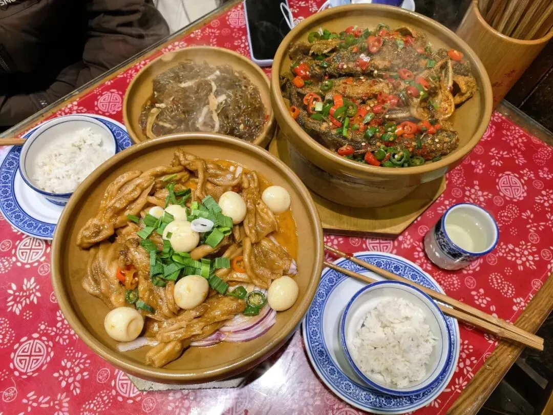 果然,进门便见一楼几乎坐满,多是本地的嗲嗲娭毑,笑语喧哗里透着一股熟稔的自在。等了一小会儿,才在店员带领下找到一张刚空出的方桌。抬头看菜牌,名目虽多,却都离不开那一口圆墩墩的陶钵--原来这便是钵子菜的灵魂,暖融融地煨着滋味,也煨着常德人热络的生活。我们点了黄骨鱼、无骨鸭掌与粉丝包菜。不多时,三只陶钵端上桌,热气伴着菜香袅袅升起。鱼肉鲜嫩,鸭掌Q弹,包菜吸饱了汤汁……我与梦奇大快朵颐,吃得钵净碗空。腹中饱满,倦意也悄然爬上眼皮。我们带着满心的暖意与味蕾的余欢,缓缓离开河街,回到酒店。窗外的城市渐渐沉入暮色,而我们,也坠入了一场绕有湖光与佳肴的酣眠。