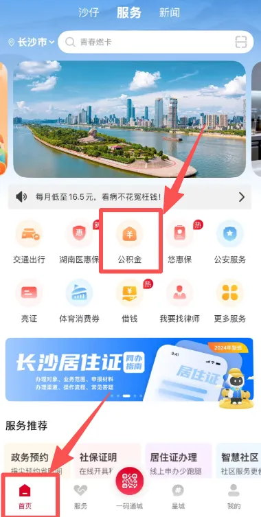 1.打开我的长沙APP,点击首页-公积金