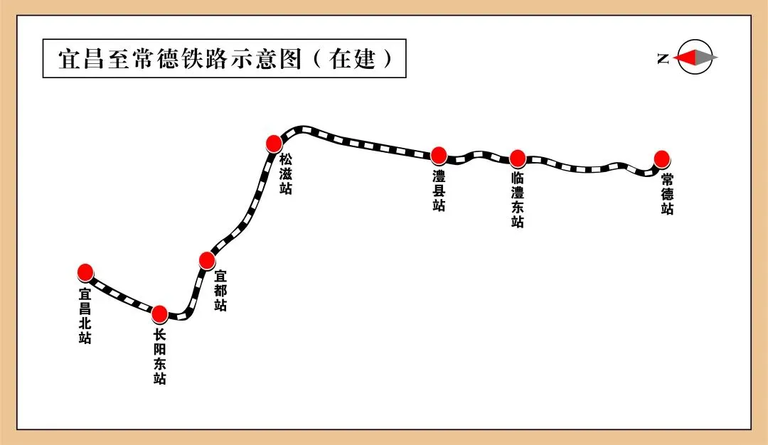 宜常铁路沿途将设7个车站。其中,湖北境内4个,宜昌北站、长阳东站、宜都站、松滋西站;湖南境内3个,澧县西站、临澧东站、常德站。