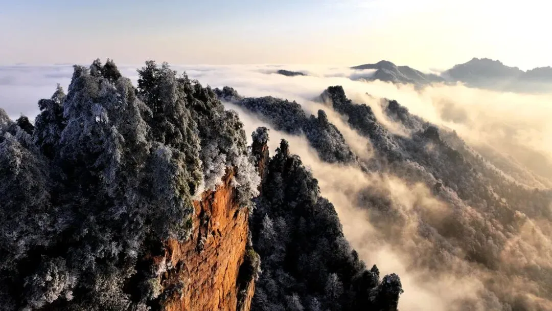 雪后初霁的湖南张家界国家森林公园天子山银装素裹、云雾缭绕。吴勇兵摄