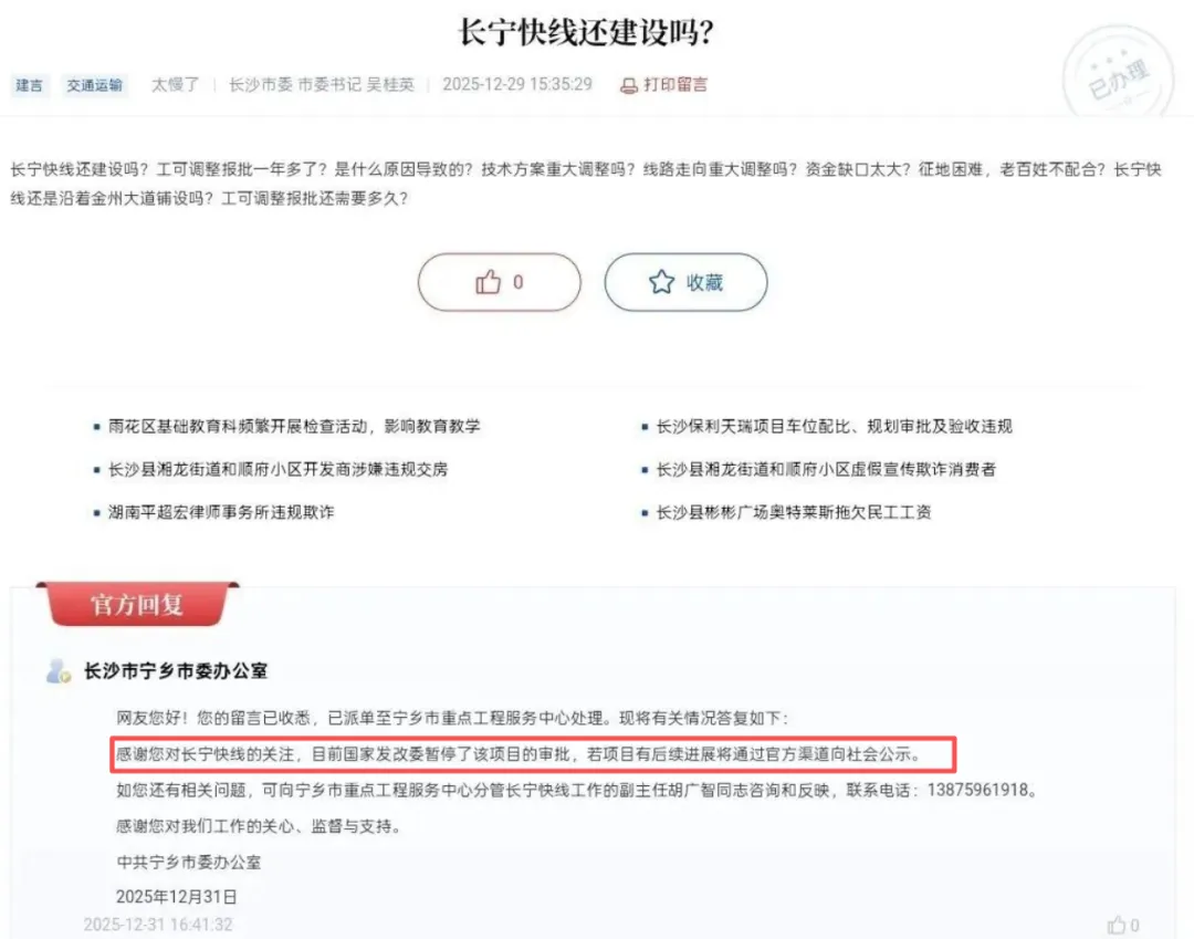 长宁快线(长丰-宁乡高铁站),里程约36.3公里,备注为:已批待建。然后,至今我们在网上没有搜寻到任何关于长宁快线开工的消息。其实,2024年初,长宁快线曾经动作频频,各项前期工作快马加鞭。但是,沿线部分市民WQ,于是这条轨道交通线路就这么被搁置了。如今这条磁浮快线建设可谓是如火如荼,一高架桥长龙即将成型。目前国家发改委暂停了该项目(长宁快线)的审批,若项目有后续进展将通过官方渠道向社会公示。绿城黄土塘:五一广场一中本部旁,绝对市中心,双正地铁口。媲美八方小区的顶级双名校学区房(预计配套入读长沙市一中初中本部+长沙市一中附属小学本部),长沙配套教育最牛逼的新房。主推约120-170平新规产品,置业顾问:邓伟15580982009(微信同号)。绿城悦海棠:观沙岭最后的宝地,绿城王炸新规户型,得房率120%!置业顾问:严朦-18472888881(微信同号)。