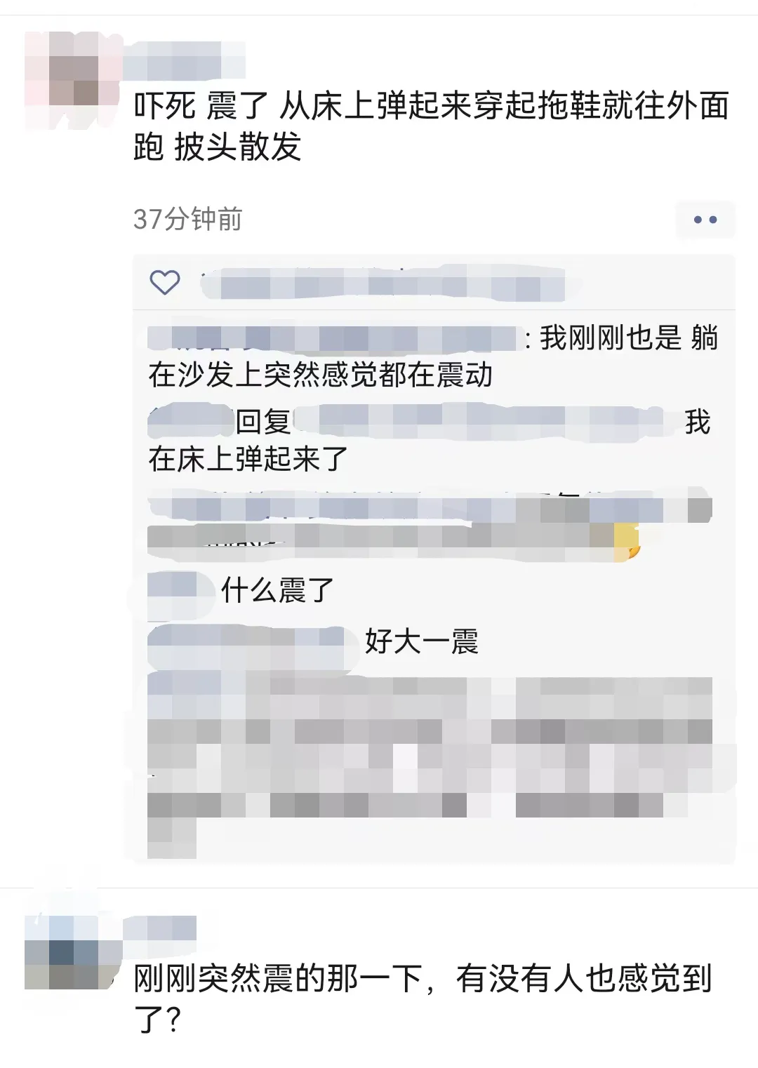 家住津市的李先生表示没有明显感觉,“但是我朋友圈有人感受很明显,有直接从床上弹起来的,也有躺在沙发上感觉到晃的。”