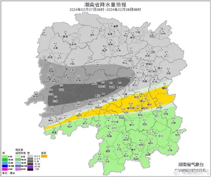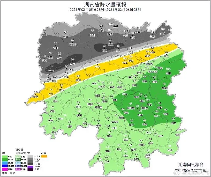 湖南省气象台(5日08时发布)预计,未来三天湘中以北雨雪冰冻天气将再度加强,5日至6日湘北部分地区中到大雪、局地暴雪,7日湘中部分地区大雪。