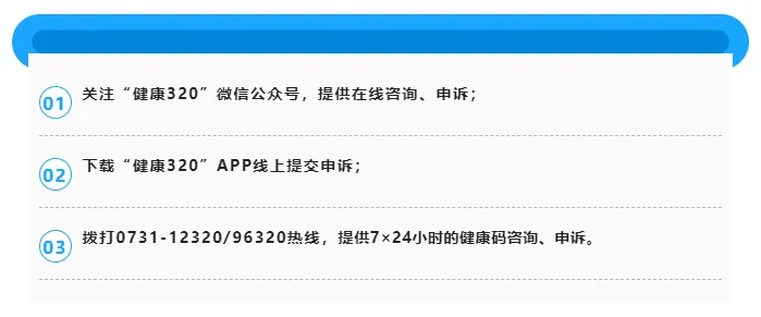 如需咨询湖南省健康码申诉等相关问题可拨打0731-12320/96320热线,7×24小时受理市民解码申诉,及时解答市民的疑问。