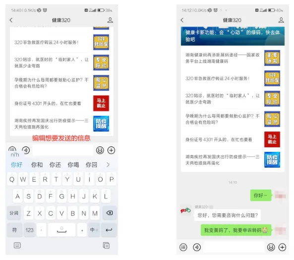 注意:微信公众号仅处理湖南省黄码申诉,根据客服提示发送个人相关信息(姓名、联系电话、身份证号码以及近期核酸检测记录)符合要求申诉予以转码。(PS:只需要发送符合申诉条件后的核酸结果及姓名电话身份证号即可,无需重复刷屏,会将有效信息覆盖,影响申诉处理)