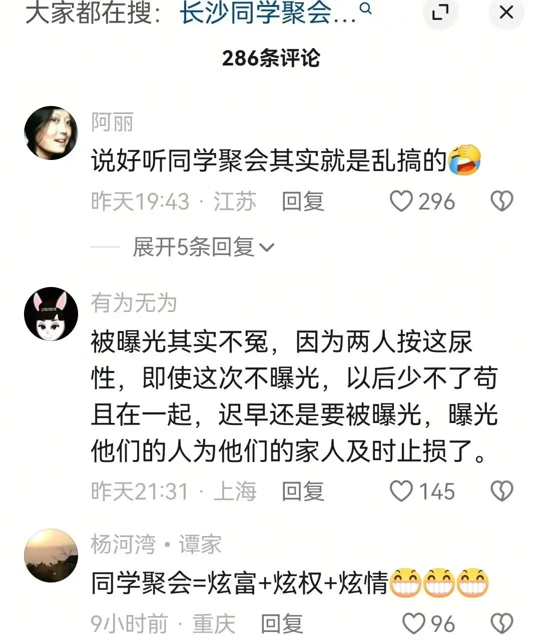 结果放到网上后,直接被顶上了热搜。本来他们这些同学之间发生的事情,全网都知道了。涉事男子的妻子,还有涉事女的丈夫,他们都表示极大的抗拒。
