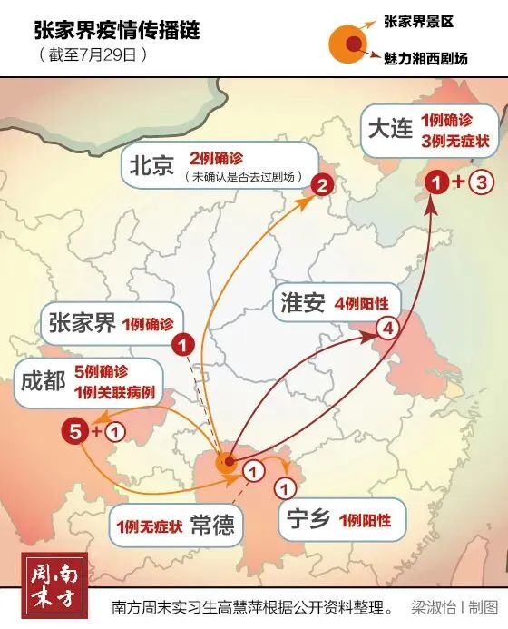 剧场游客带来的辐射效应波及全国。但剧场仅为轨迹交集点,而非疫情发源地,传播链的源头尚未可知。德国华裔病毒学家、埃森大学教授陆蒙吉对南方周末记者表示,传播链源头需要通过进一步流调才能查明,但也可能没有明确的最终源头。“不过南京机场大批相关人员感染,总体早期扩散的场所可以确定在那里。”陆蒙吉指出,扩散的程度导致过路旅客感染,说明已经有相当规模,后继可能在其他城市会发现病例。目前,因疫情防控需要,南京禄口机场已关闭,所有国内国际航班暂停。南方周末记者以游客身份咨询,机场工作人员表示:“机场目前处于关闭状态,至于什么时候开放还要等进一步通知,近一周机场在进行大面积消毒工作。”汉莎航空、韩亚航空、意大利勒奥斯航空也相继发布通知,取消近期前往南京的航班。后续影响已然出现。7月28日晚开始,张家界市扩大核酸检测范围,市民连夜排长队做核酸检测。由此关联的全国各地也迅速采取了相应措施。山东省莱州市接到上级指挥部的紧急通知,在流行病学调查后,排查出3名当晚在魅力湘西剧场的观众,并公布行程,发布通知紧急寻人。四川省卫健委通报对确诊病例相似轨迹的密切接触者进行排查。最新消息是,曾去过张家界的成都市一家三口确诊,但没有去魅力湘西剧场。重庆市迅速开展排查。7月28日晚消息,排查出与成都确诊病例密切接触者两名,并公布了行程。关联线另一端的湖南省常德市,感染者所在的武陵区于7月27日晚连夜开展调查,共排查出密切接触者和重点人群447人,并根据感染者的活动轨迹划定重点区域,落实管控措施。家住湖南省常德市的文女士,也受到波及。她在7月29日告诉南方周末记者,仅一街之隔,家对面小区的业主便是常德市无症状感染者,该位感染者所住的小区7月28日早上5点多便已经封闭,该小区所有人员均已核酸排查。连她在内,周围许多朋友都在29日早上排队自费去做了核酸检查,“因为大家在同一条街上,一起跳舞的有几个是被封小区的人”。截至7月29日下午,据初步统计,已有5省6地18例病例关联张家界,分别是江苏淮安、辽宁大连、湖南常德、湖南宁乡、四川成都、北京等地。四川省一名流行病学专家告诉南方周末记者,这一传播链初始时,张家界人口流动性太大,密接人群可能受到传染,但是这种传染接触后的人员达到一个峰值之后会下降。“控制很重要,除非变异株的强度真的很强。”陆蒙吉则提醒,和以往一样,这次疫情可以通过大规模检测和社区管制来控制,但更深层的问题是如何防止类似事件再次发生。