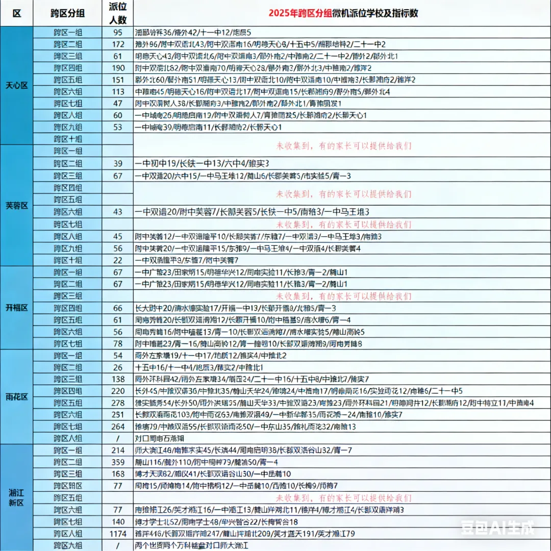 需要注意的是,2025年芙蓉区和开福区的跨区分组都有较大的变化,芙蓉区把原来的第九组拆分为了九、十两个分组;开福区原来的跨区六组变成了跨区五组,原来的跨区五组拆分为了跨区六组和七组。所以大家在参考往年派位指标的时候,也要相应的有所调整。