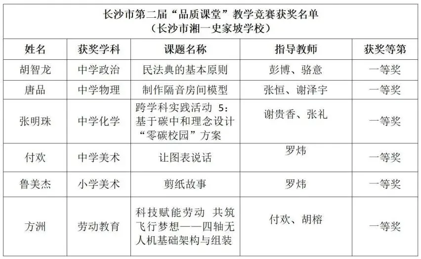 在长沙市第二届“品质课堂”教学竞赛活动中,我校共有6位教师凭借扎实的专业素养、创新的教学方法和精彩的课堂呈现脱颖而出,荣获一等奖。分别是中学政治组胡智龙老师、中学物理组唐品老师、中学化学组张明珠老师、中学美术组付欢老师、小学美术组鲁美杰老师和劳动教育组方洲老师。