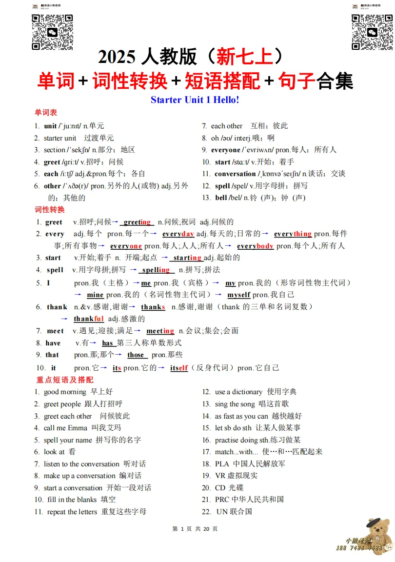 这是我给学生们用的《七上各单元核心知识梳理》的一部分(以Starter Unit 1为例):