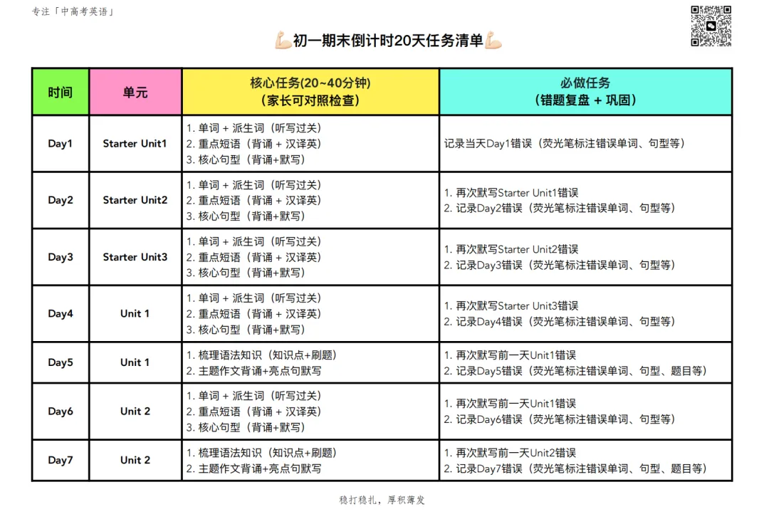 我知道家长最愁的就是“每天具体让孩子复习什么内容”。我把我带学生用的《初一期末20天冲刺计划表》直接放下面了,从Starter Units到后面的7个正式单元,每天任务清清楚楚: