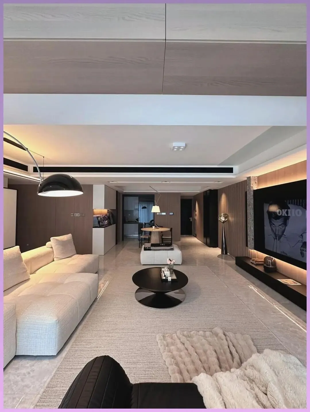 先说结论:这家是真正为“懒得打扫又想体面生活”的人装的家。没复杂造型、没堆砌硬装,靠大横厅+无主灯+一条长地毯,硬是把普通高层公寓整出了电影感。