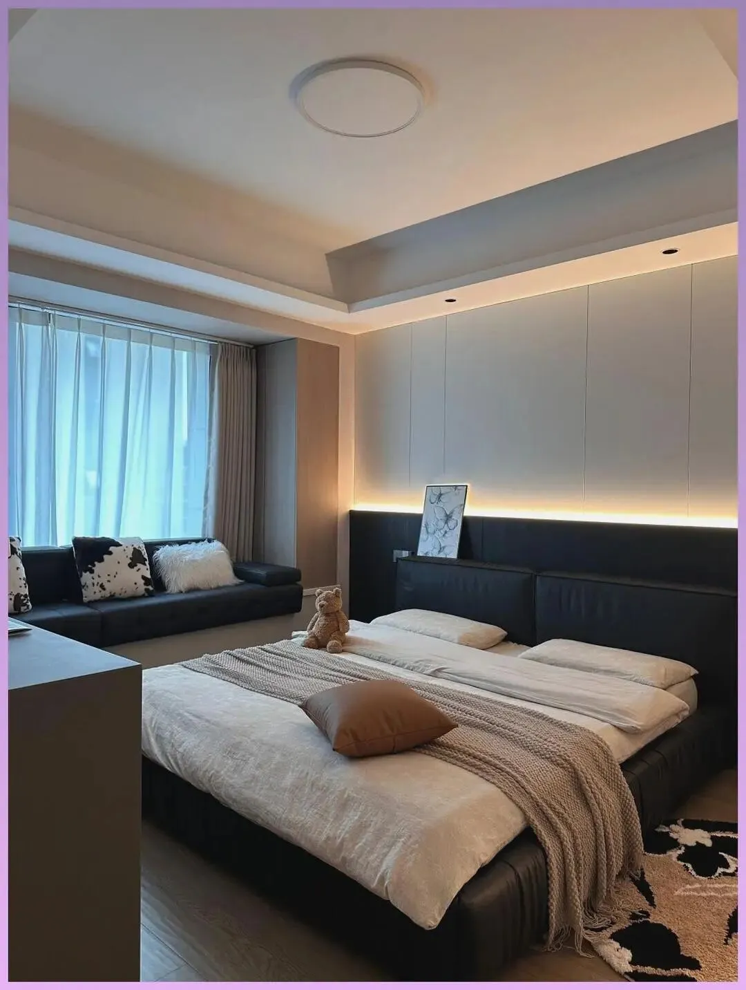 卧室是整个家我最满意的地方之一。没有艳色,墙顶一体的浅灰+木色,再来一张宽得离谱的黑色大床,视觉冲击力直接拉满,但躺上去的那一刻,只剩下安心。