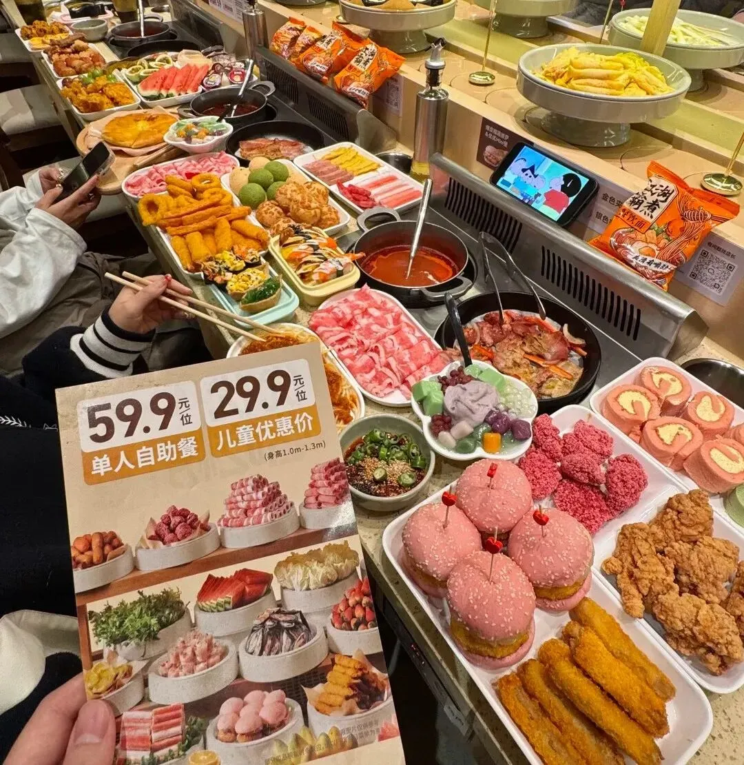 优鼎优自助小火锅:“火锅+烤肉”双自助模式,最高日排超2000桌,品类融合的集大成者,同一团队打造的“升级版举高高”,最大看点是“59.9元火锅+烤肉双自助”,并融合披萨、寿司、糖葫芦等,被顾客称为“旋转台上的7-11”,据了解,其毛利仅有48%,足见其背后的供应链能力有多生猛。