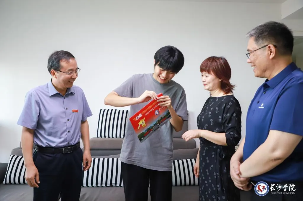 “恭喜你被长沙学院录取!”7月4日,校长陈赤平携党政办、研究生学院、马栏山新媒体学院负责人来到长沙市雨花区湘水一城小区,将学校首封硕士研究生录取通知书送到新生李宁康手中。陈赤平表示,这是我校办学历史上第一份研究生录取通知书,代表着同学们学术生涯的新起点,学校将全力为研究生成长提供一流平台,希望首届硕士研究生珍惜机遇,追求卓越,与学校共同书写高质量发展新篇章。