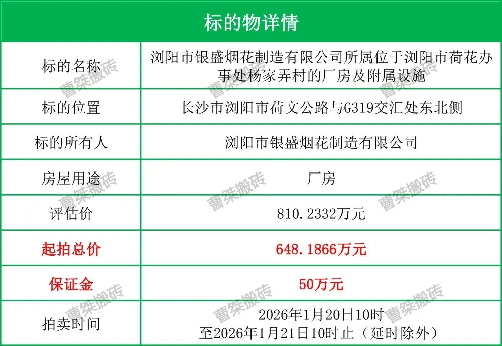 位于浏阳市荷文公路与G319交汇处东北侧的一处花炮厂房及配套设施设备打包拍卖,其中厂房及配套简易棚房总面积14156.972㎡,打包起拍价648.1866万元。