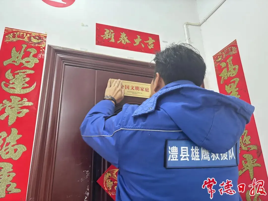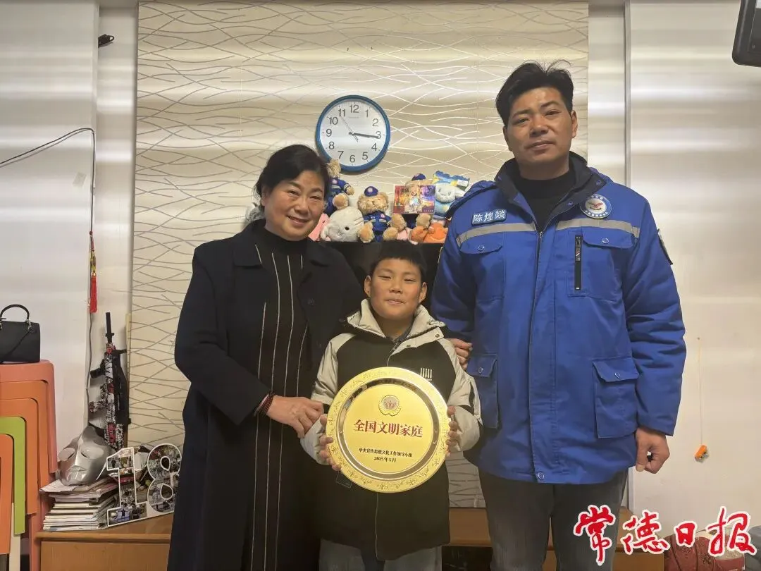 常德日报记者 杨晟 实习生 张雅琴 文/图/视频 近日,中央宣传思想文化工作领导小组为澧县陈煌燚家庭颁发了“全国文明家庭”的荣誉奖牌,由县文明办及社区工作人员送至其家中。该荣誉不仅是对一个家庭文明风尚的肯定,更是对奉献精神与优良家风的生动褒扬。