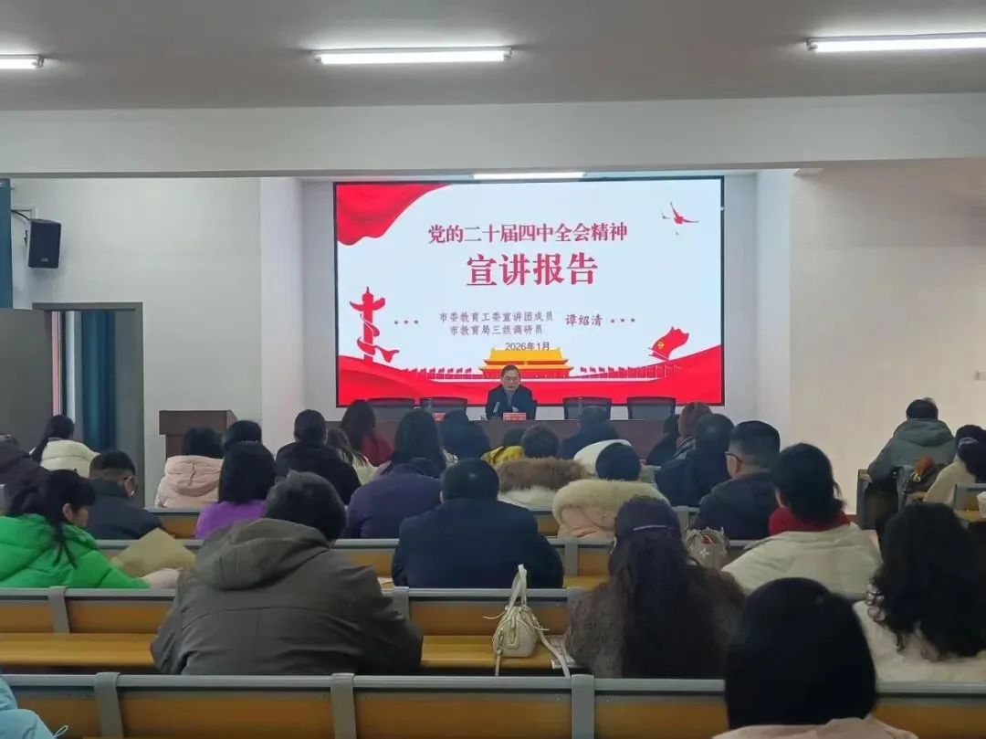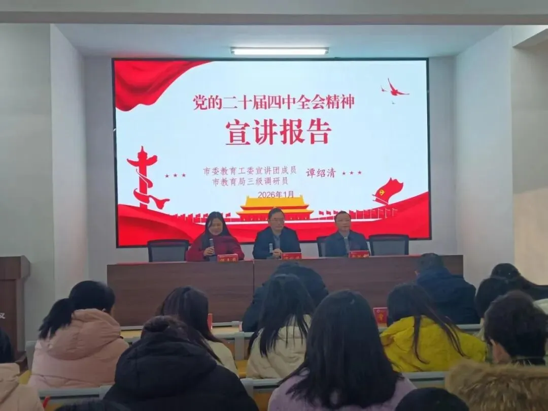 1月5日,市委教育工委宣讲团成员、市教育局三级调研员谭绍清、市教育局老干科科长龚跃虎莅临常德市第四中学,为全体教师作党的二十届四中全会精神专题宣讲。宣讲会由党总支书记何志莉主持,全校教职工齐聚报告厅,现场氛围热烈。