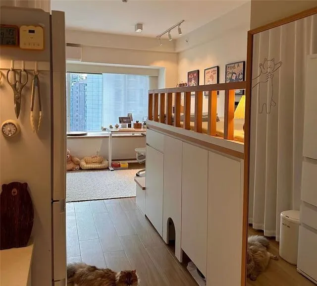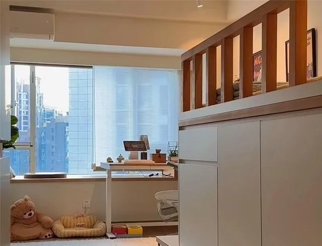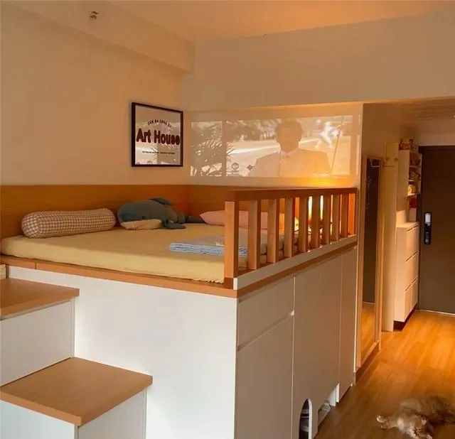 高低台床这个思路,我是真服气。以前总觉得地台床太矮,收纳不方便。长沙这姑娘直接做成架高版,底下能塞衣柜、猫窝、杂物,床上还能用来投影。别说,省下了买电视的钱,还能把卧室和客厅功能合一。我们小区有户人家做了上下铺,底下放洗衣机,结果用了一年,上面那层全成了储藏间,根本没人睡。架高床这种做法反倒是空间利用得更顺。