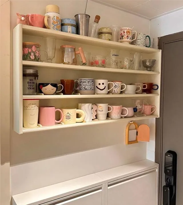 说收纳吧,单身住其实不难搞。你看这姑娘的鞋柜和吊柜组合,柜门不做全封闭,直接放杯子当展示,省了装饰的钱,还顺手。我们小区也有邻居这么弄,有时候回家,杯子、钥匙、快递刀都直接往上搁,进门就能用到,别提多方便了。反倒是那种全做满柜的,看着整齐,实际用起来没那么顺手。
