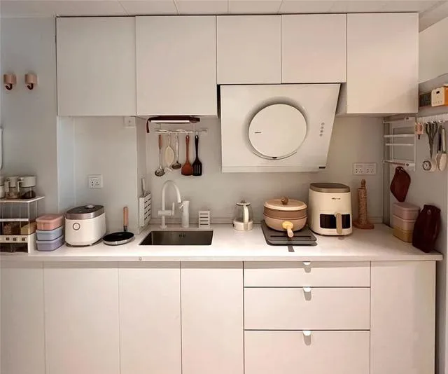她家厨房直接连着走廊,开放式布局是小户型的救命稻草。其实我自己家也考虑过封闭式,后来一算,墙一砌出来,台面反而更小。长沙这户用吊柜和底柜分层,电磁炉代替燃气,台面虽短但基本能应付一日三餐。我朋友家喜欢做饭,非得要双灶,结果空间全被占了,锅碗瓢盆没地放,最后下厨还得把菜板搬到餐桌上切菜,反而不如小巧灵活的实用。