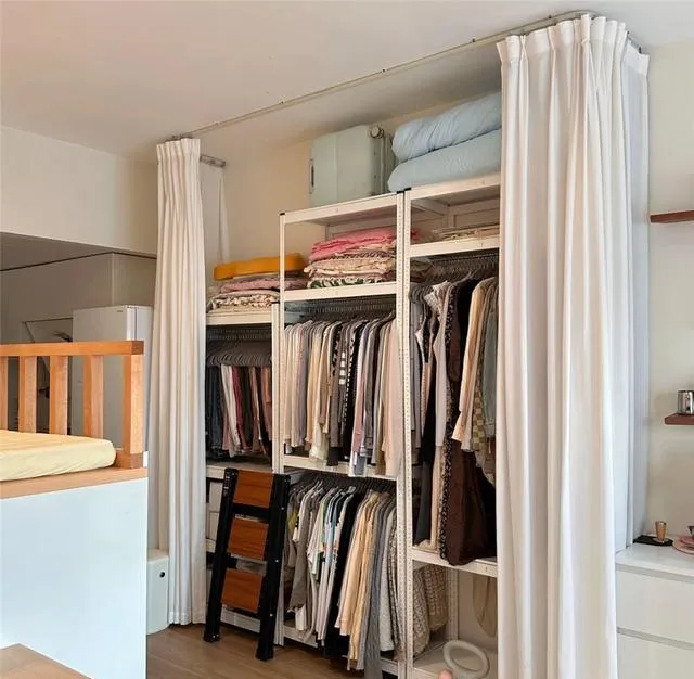床对面那一排通顶收纳,简单拉个纱帘,看着透气又省钱。大衣柜门如果做成实木或推拉,价格直接翻一倍,还容易坏。纱帘随便洗,轨道挂上,十几分钟就能换新,日子过得就是省心。