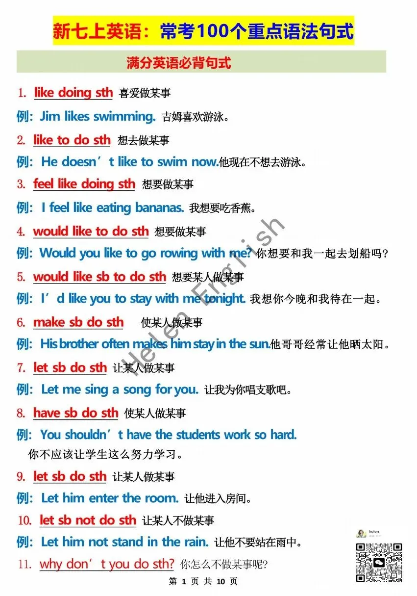这是我整理并一直在让自己学生用的好工具《初一满分必考短语搭配》