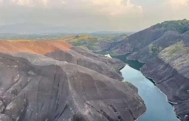 中午转去高椅岭,短短十几公里的车程,风景却大不相同。这里的丹霞地貌,有着刀切般整齐的红色岩壁,脚下的水库清澈见底,倒映着蓝天白云。无人机在这里能拍出极佳的效果,但雨天千万别冒险,路滑得让人打怵。下午的光线最好,红岩在阳光下泛着暖色,像是被一层薄金覆盖。