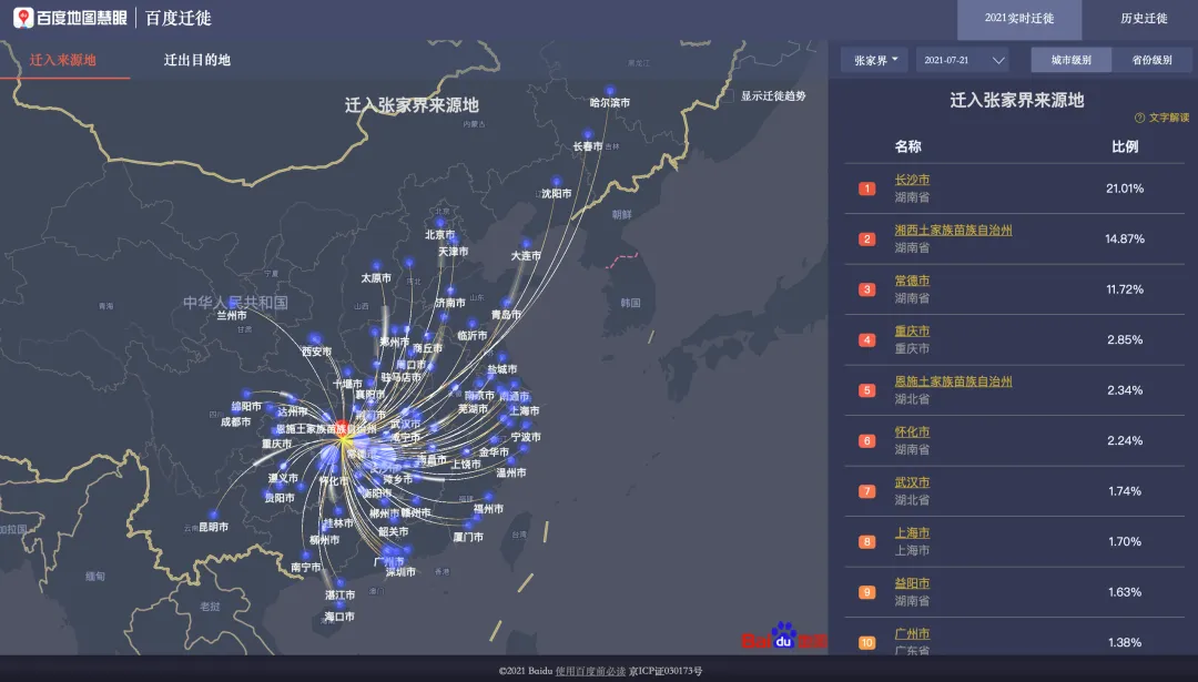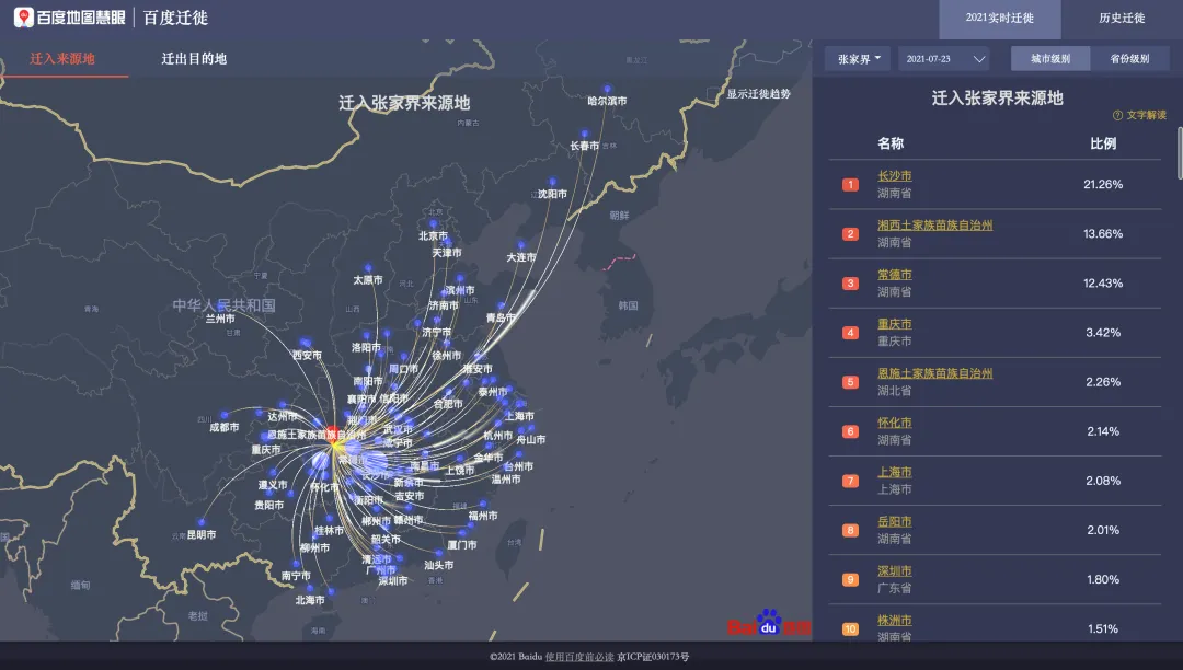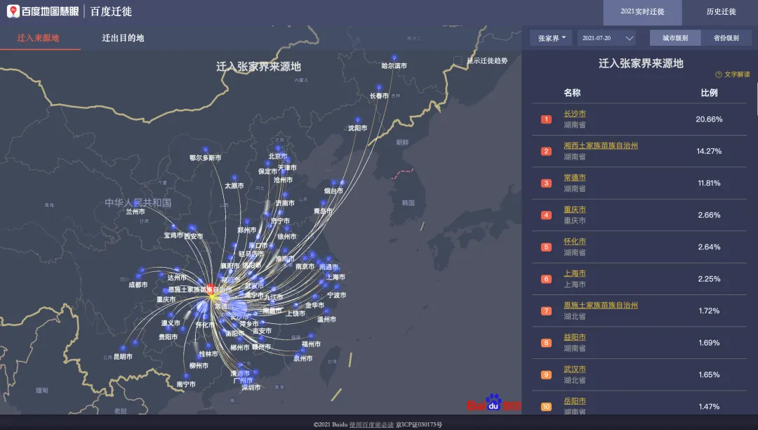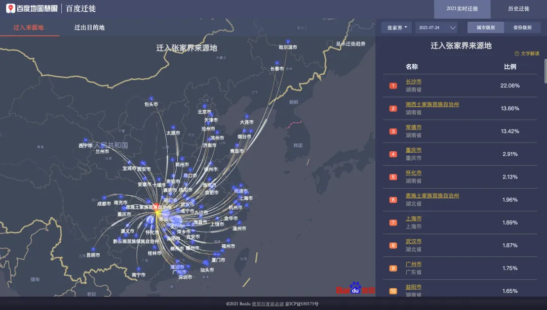 记者查阅百度地图慧眼的迁徙大数据则显示,7月20日到24日,迁入张家界的城市中,长沙,常德排在前列,其次是外省的重庆,上海,武汉,广州,深圳等。