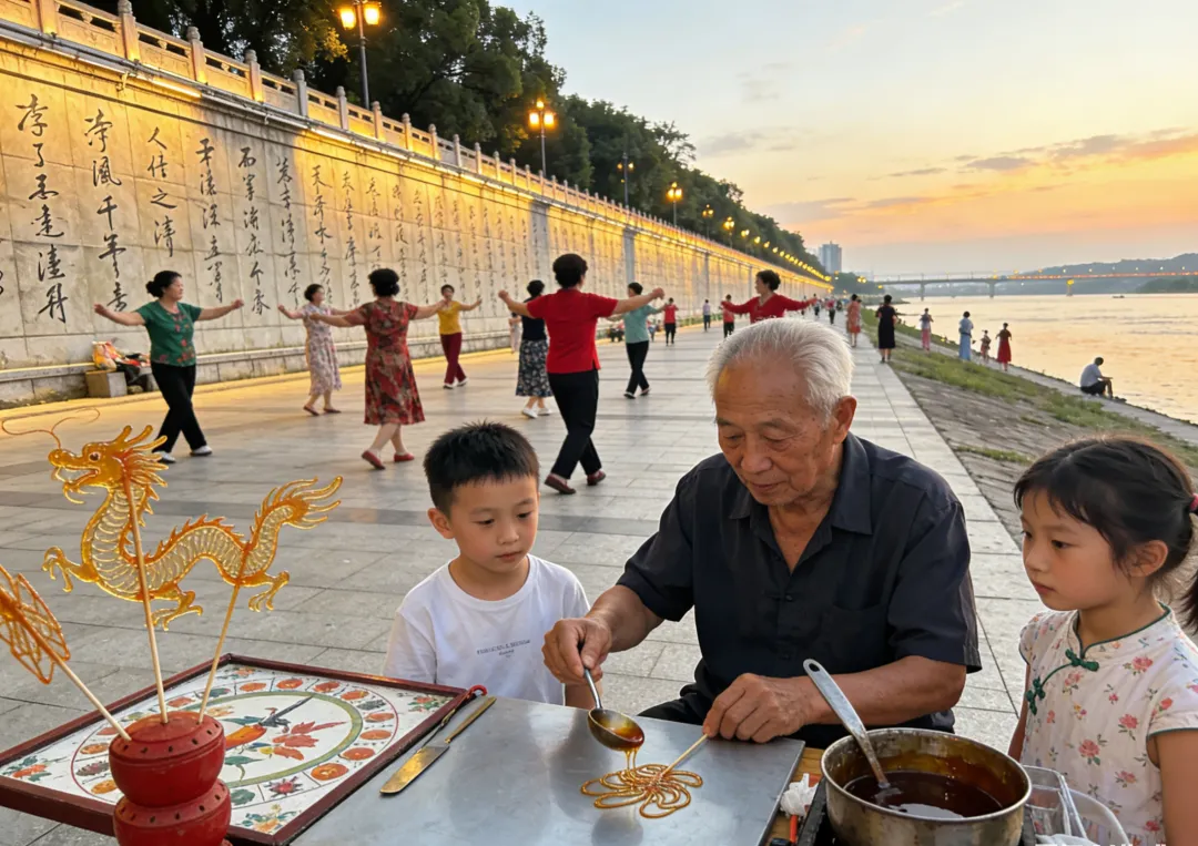临走前特意去了诗墙公园,两公里长的墙上刻满了诗词,背后就是缓缓流淌的沅江。晚风一吹,江声伴着远处的广场舞音乐,大爷大妈们跳得不亦乐乎,旁边糖画师傅一勺糖就画出一条龙,孩子们看得眼睛发直。坐在江边的石凳上,手里拿着没吃完的蒿子粑粑,外脆里糯,满是春天的清香,突然就懂了为啥有人愿意在常德待半年——这里的日子不紧不慢,美景裹着烟火气,连空气都让人舍不得离开。