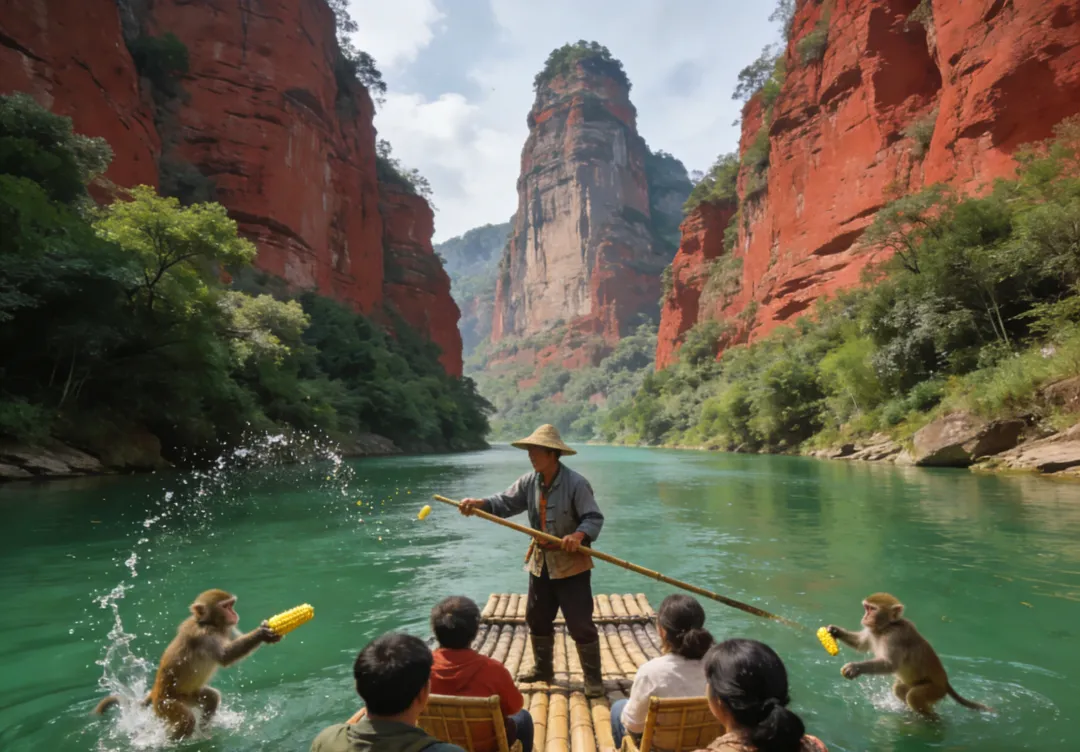 打卡亮点:乘竹筏穿行碧绿水道,让师傅带往“野猴峡”支流(无额外收费),扔玉米诱拍猴子跳水;15点后返程,赏夕照丹霞石峰,光影绝美。