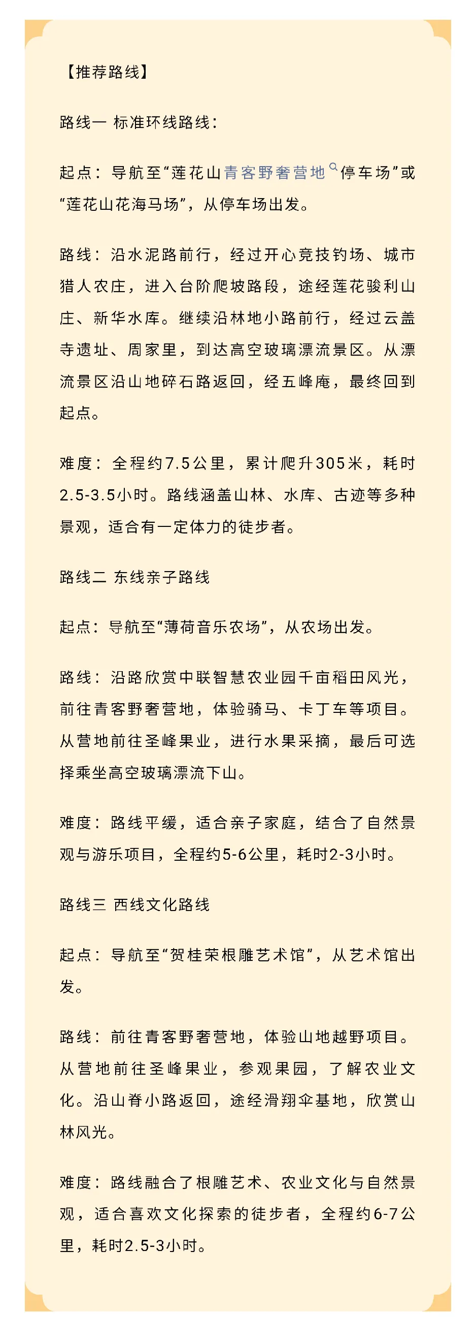 我们是从山脚下沿着公路开始往上爬,从山脚到山顶徒步1个小时左右,爬山难度不大,适合带小孩爬山,山顶视野开阔,可以看到城区和附近镇上的风光,山顶有国家气象雷达标校基地和长沙莲花山滑翔伞基地。山顶还有吃饭的餐馆和民宿,还有高空玻璃漂流、圣峰果业采摘园、卡丁车、湖南户外莲花山露营基地等。我们从图一处开始往上爬,这条路线到山顶没有经过新华水库和半山腰的唐代寺庙云盖寺遗迹(这两个地方在山的另一边,要走环线可以经过),莲花山景区的其他景点基本经过。