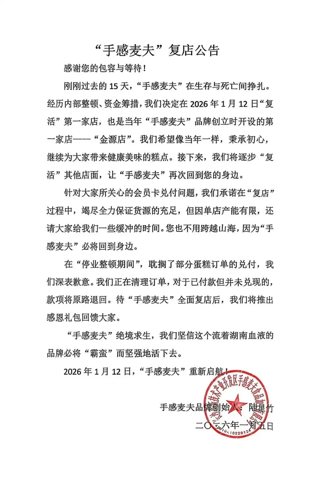 1月5日,长沙@手感麦夫 发布“复店公告”,称在刚刚过去的 15 天,“手感麦夫”在生存与死亡间挣扎。经历内部整顿、资金筹措,我们决定在 2026年1月12日“复活”第一家店,也是当年“手感麦夫”品牌创立时开设的第一家店——“金源店”,其他店面将逐步“复活”。手感麦夫品牌创始人陆星竹也第一时间发视频称“没有跑路”,表示15天的挣扎与坚守,没让手感麦夫倒下,反而让他们更懂责任的重量。并恳请大家:“给我们一点缓冲时间,别让恐慌冲散我们的希望,别让过激行为堵死我们的生路。储值卡权益会保障,员工薪资会兑现,手感麦夫,想陪你继续吃面包。”此前,手感麦夫曾发公告称在品牌经营与决策上的失误,导致出现了一系列运营问题,暂停所有门店运营15天。————孟庭苇要来长沙开唱啦!————