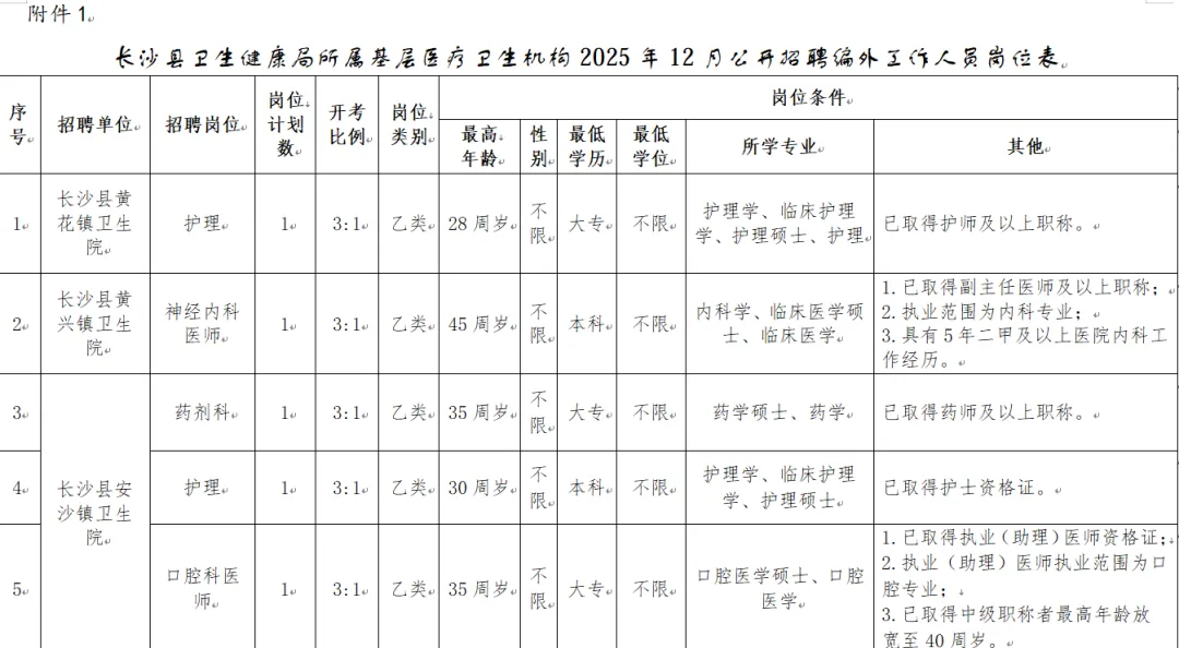 具体招聘岗位、职数及要求见《长沙县卫生健康局所属基层医疗卫生机构2025年12月公开招聘编外工作人员岗位表》(附件1)。