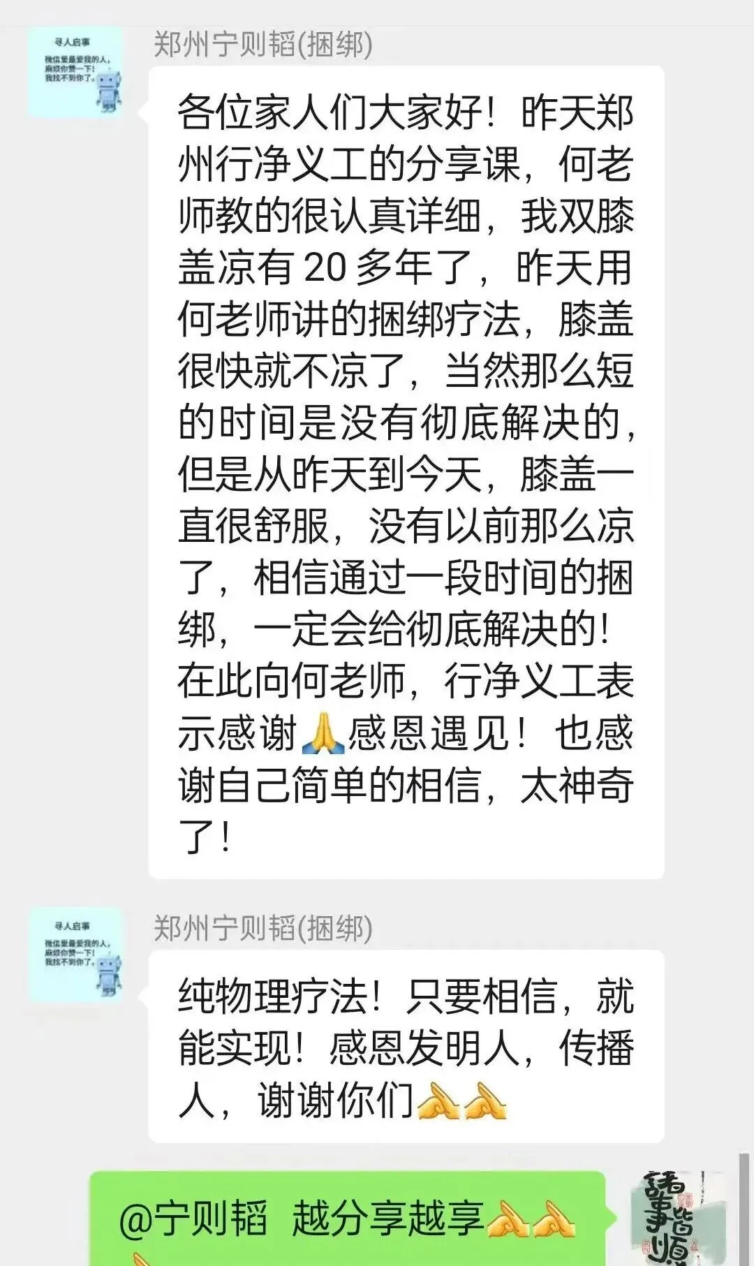 感恩淑霞老师的传播,和开心老师组织者,让我见证捆绑疗法的神奇效果。我愿意把捆绑疗法无私分享出去!