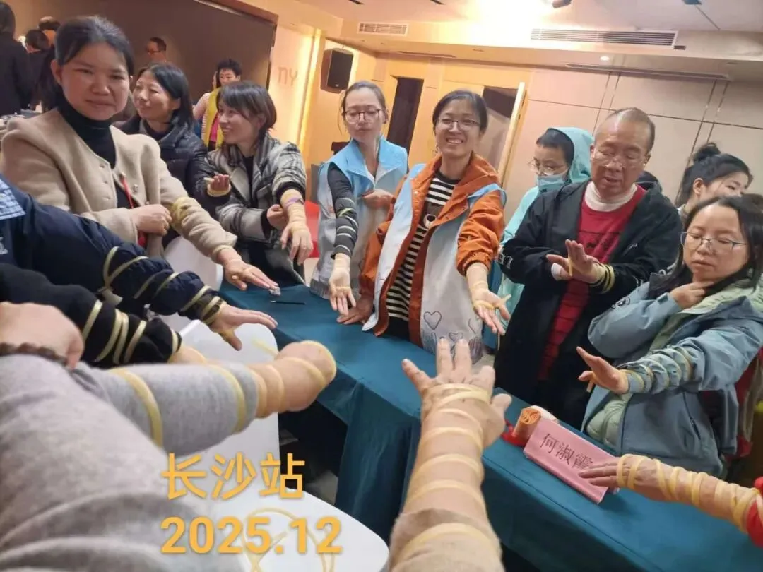 终于到了下半场捆绑疗法的实操环节,大家伙摩拳擦掌跃跃欲试。在淑霞老师再三提醒禁止绑脖子后,同学们在她的示范带领下,绑手绑臂绑肩绑脚绑腿绑身绑头,搞到自己好似“裹蒸棕”咁。