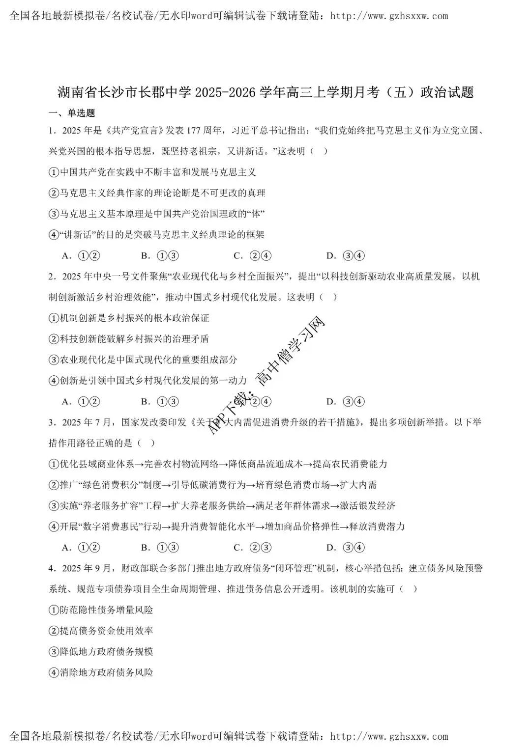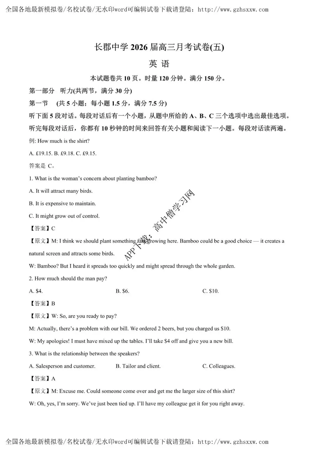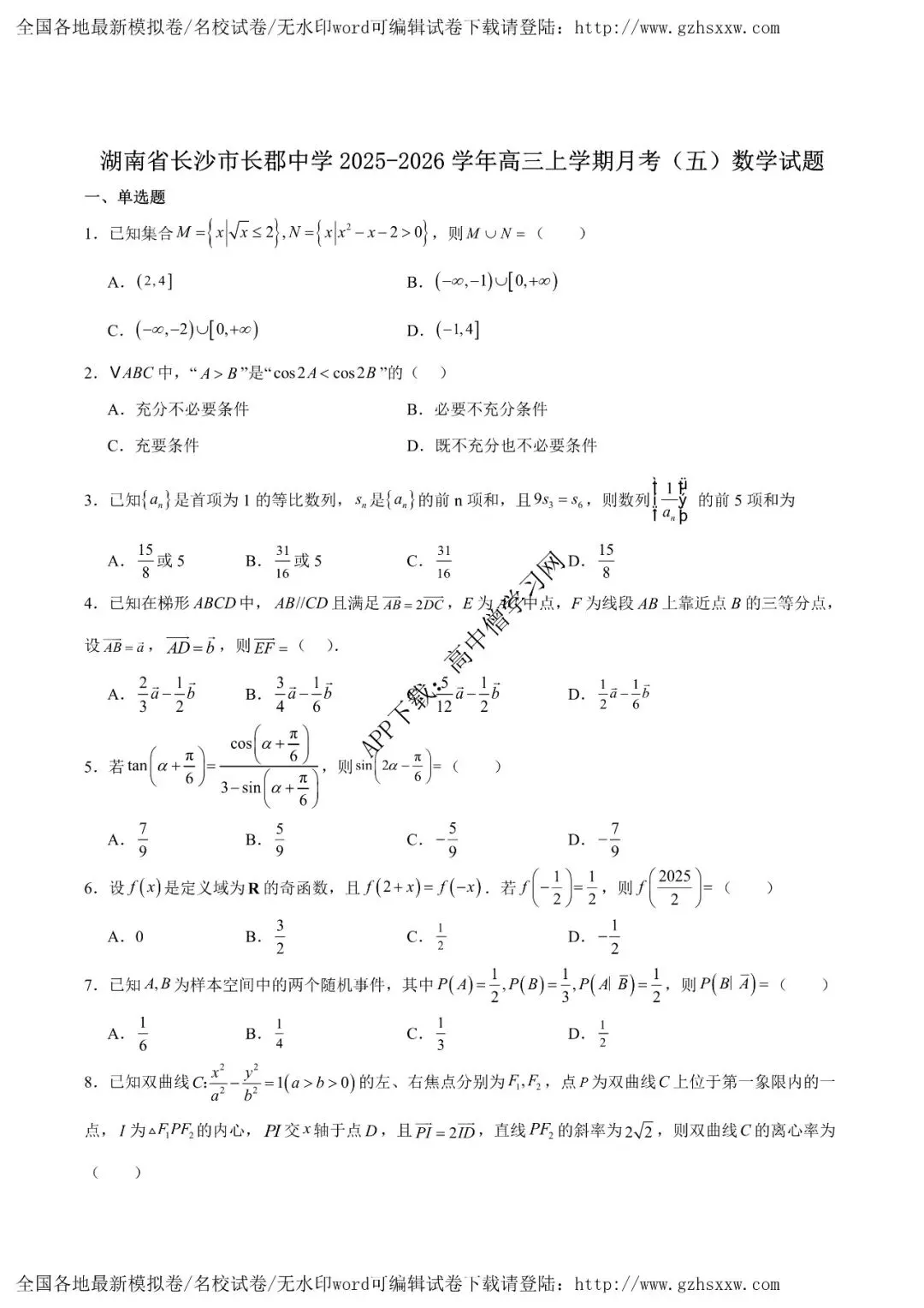 本篇给大家分享的是2026湖南省长沙市长郡中学高三上学期月考(五)