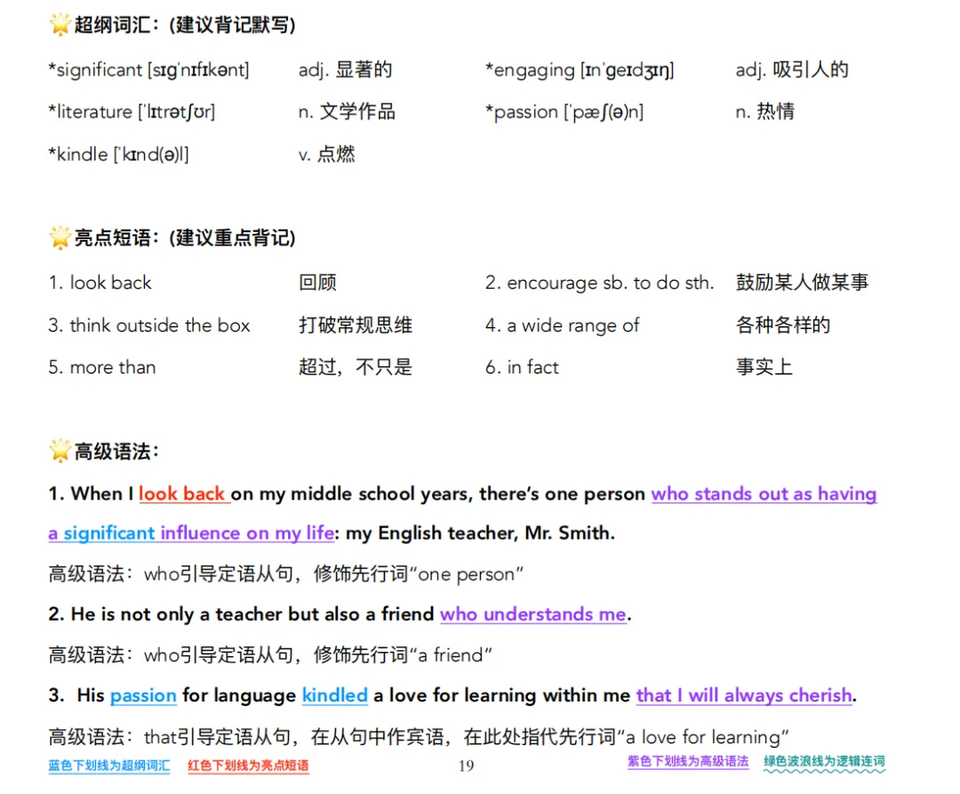紫色:是重点语法句型,能够让文章更上一个层次。