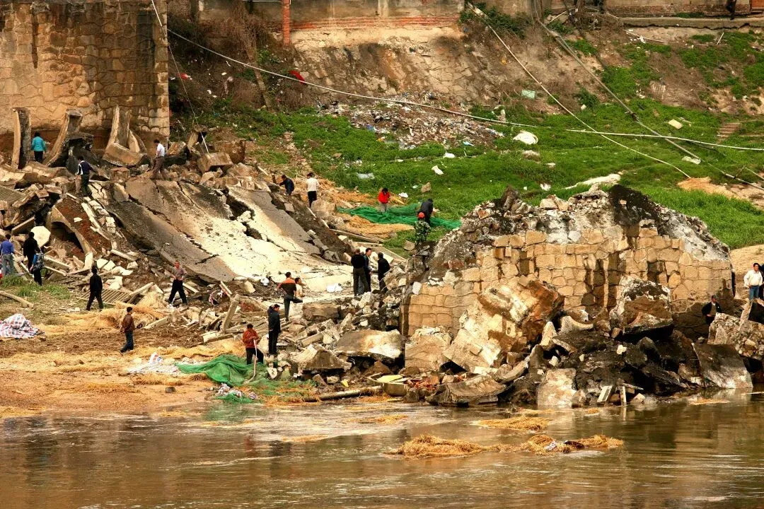 烟尘散尽后,原本挺拔的桥身已不复存在,只剩下几截桥墩孤零零地矗立在河面。