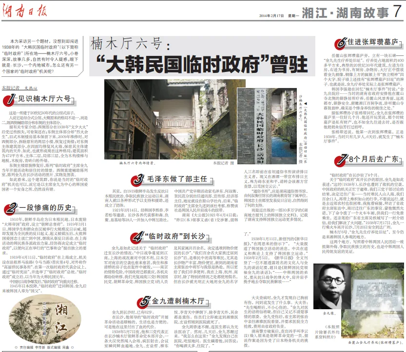 本为采访另一个题材,没想到却闯进“大韩民国临时政府(长沙)活动旧址”(以下简称“临时政府”)所在地——楠木厅六号。小巷深深,故事几多,自然有时令人疑惑。眼下就是:长沙,一个内地城市,怎么还有另一个国家的“临时政府”机关呢?