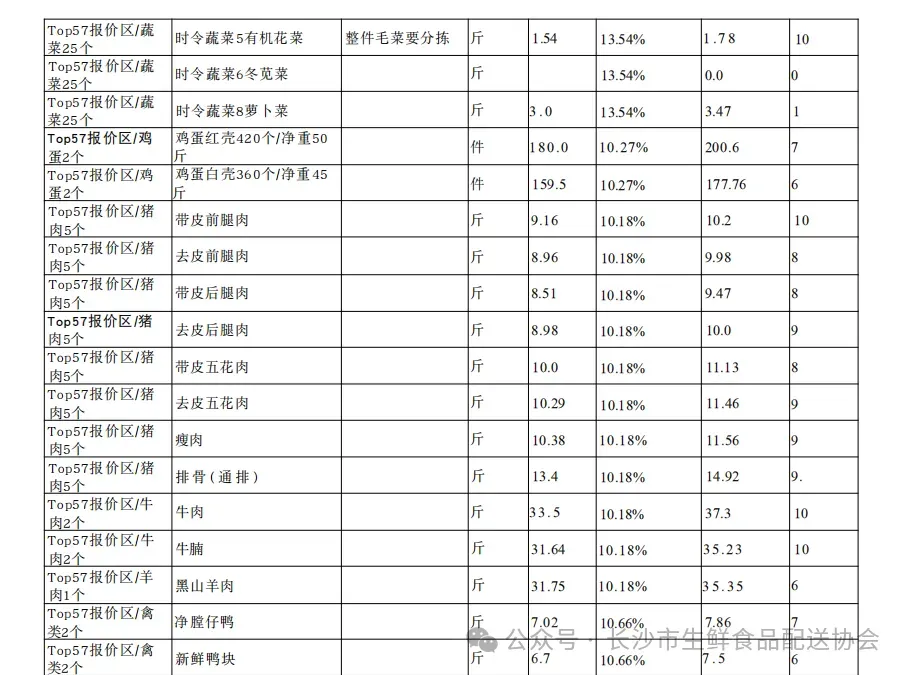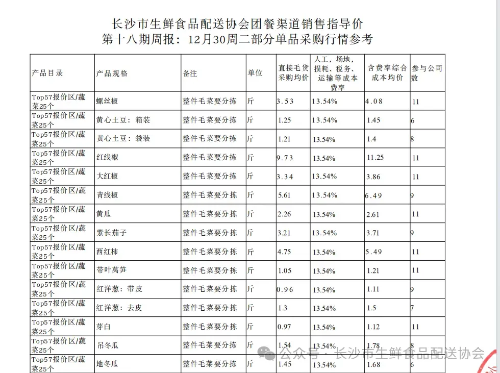 >长沙市生鲜食品配送协会直接采购成本与含费综合成本行情 参考| 12月30日 周二 周报