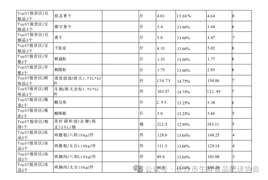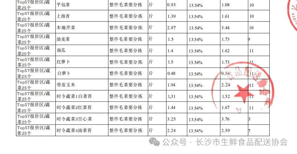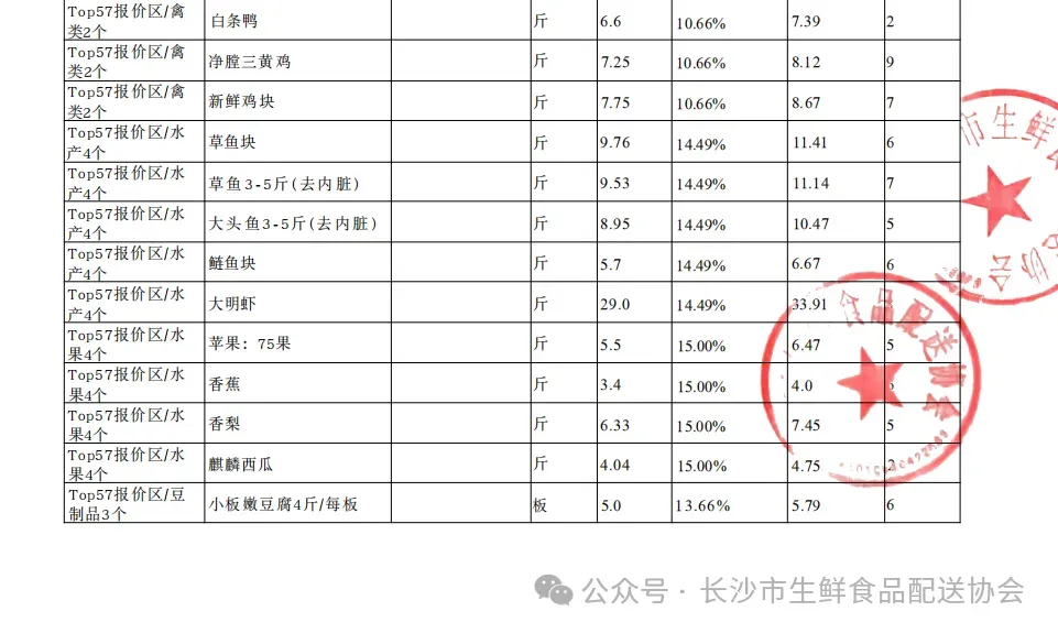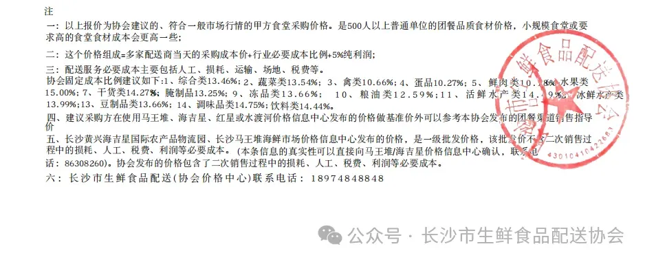 长沙市生鲜食品配送协会直接采购成本与含费综合成本行情 参考| 12月30日 周二 周报