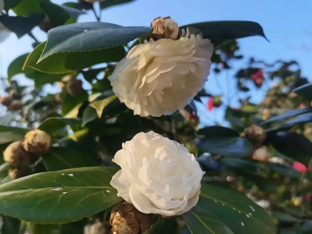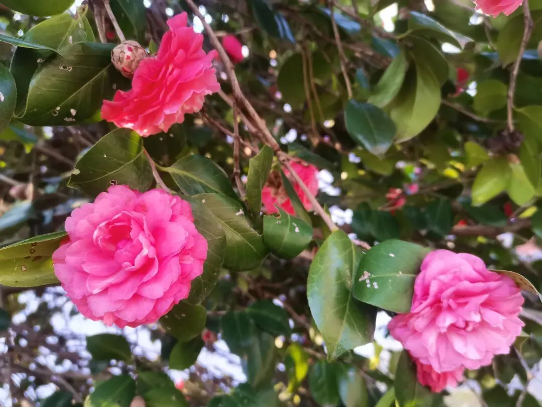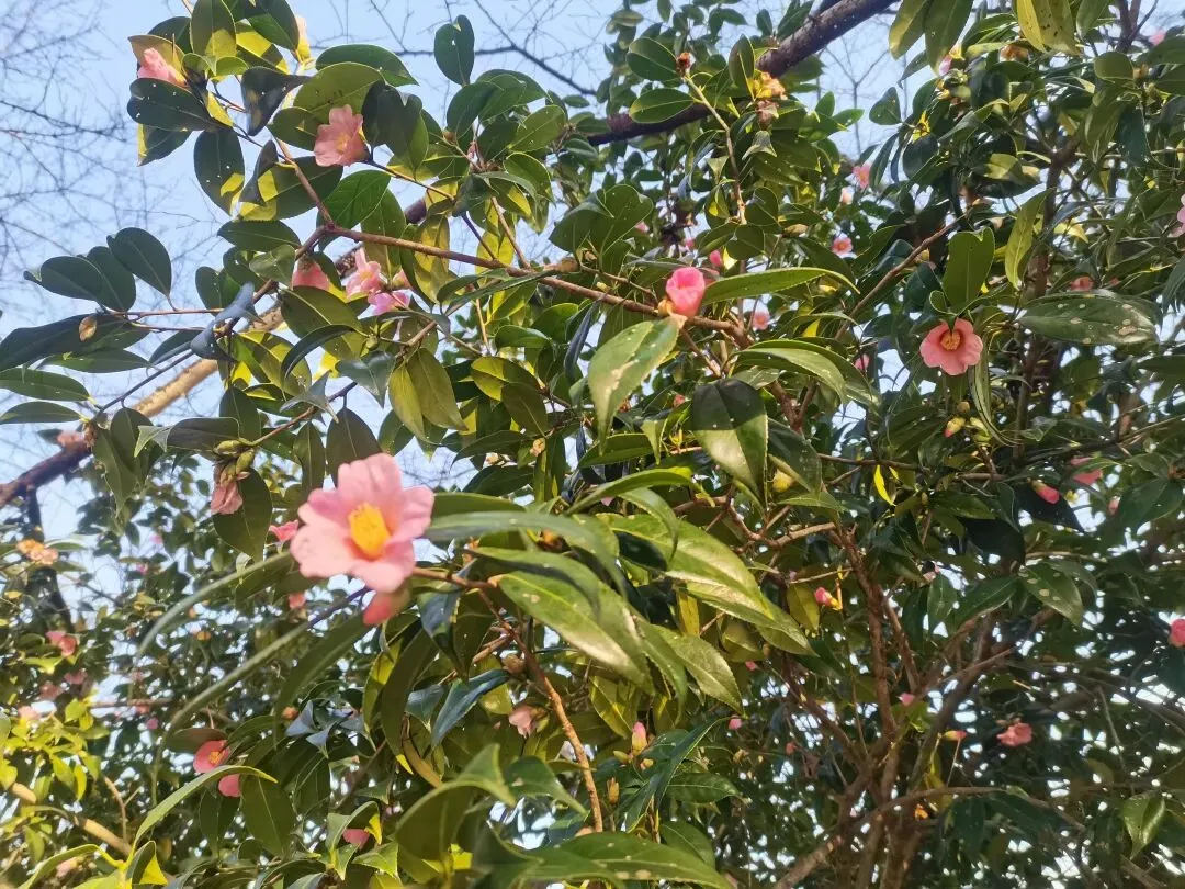 红梅还未到怒放的时候,只零星的开放了三两朵,花苞倒是站满了枝头,下周也许就能看见大片的红梅花开。 白的红的茶花也凑趣开放了几朵,路边成片的茶树结满了花苞,只等时机一到就花开满树。看见几颗三角梅老树开花,感到很意外,没想到严寒的长沙冬季也能看见三角梅的花朵。偶然看见桂花树上结的果子,恍然大悟,原来桂花还结果有种子,涨知识了。
