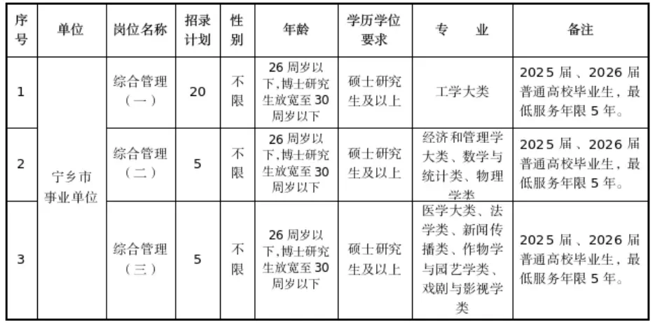根据《事业单位人事管理条例》(国务院令第652号)《湖南省事业单位公开招聘人员办法》(湘人社规〔2025〕1号)《长沙市事业单位公开招聘人员实施办法(试行)》(长人社规〔2024〕5号)和《宁乡市2022—2026年“千引”计划行动方案》等文件要求,结合我市工作需要,经研究,决定面向全国公开引进30名选拔生。现将有关事项公告如下: