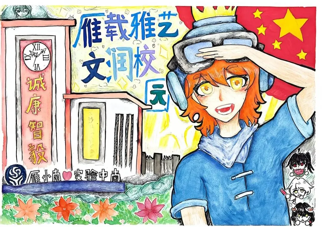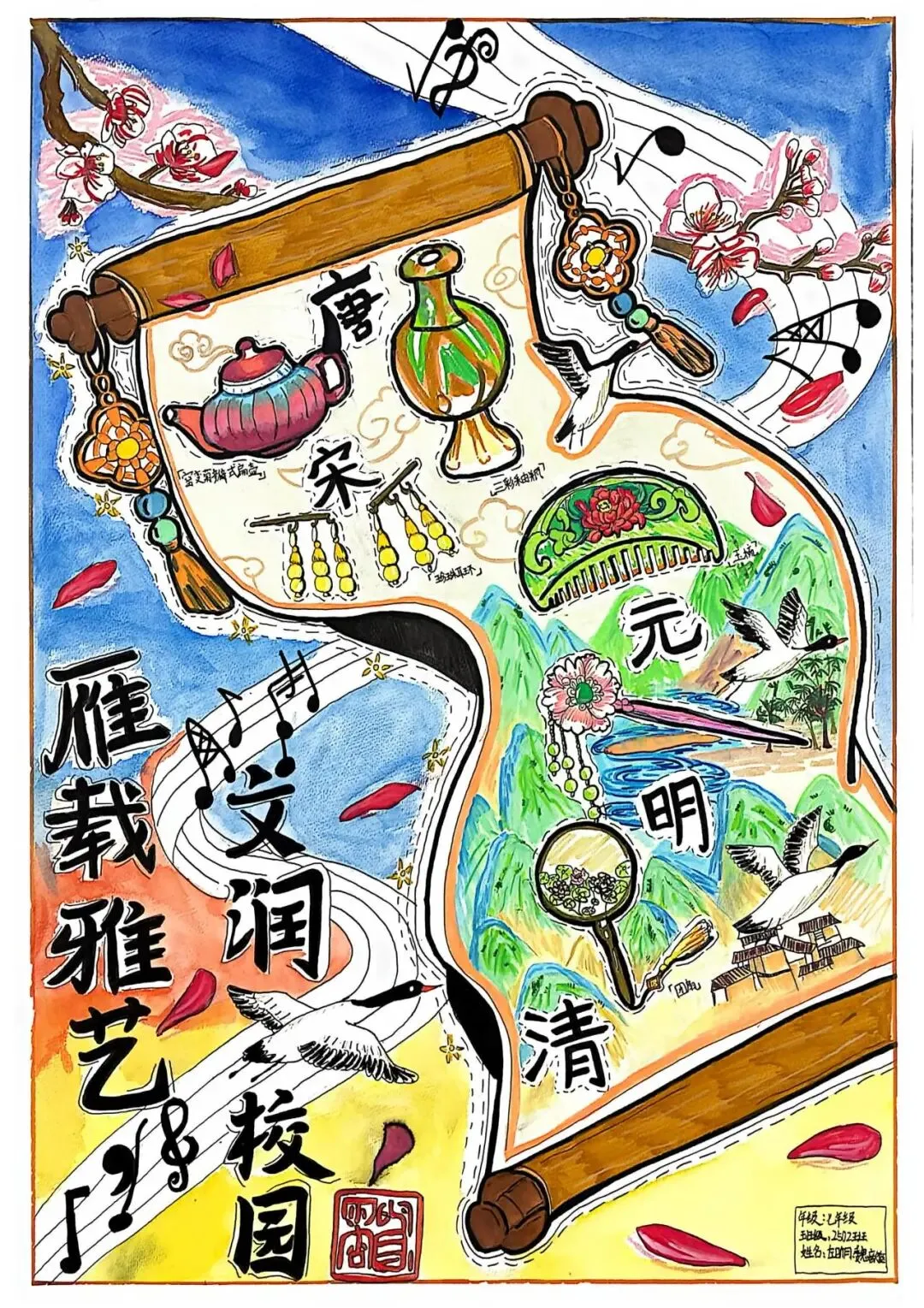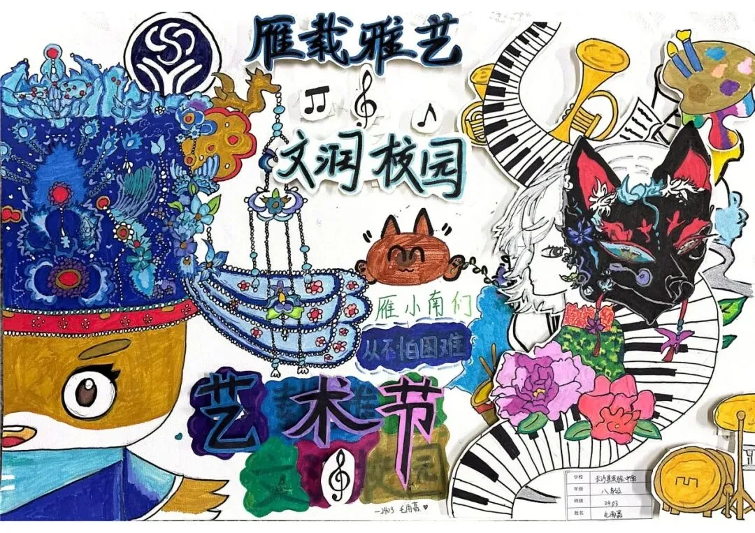 雁小南们围绕同一主题,迸发无限创意。各班凝聚团队智慧,在两幅对开画纸上,勾勒出他们对“雁载雅艺,文润校园”的独特解读。最终,部分班级的作品斩获“最佳创意奖”,另有班级的作品荣膺“最佳视觉效果奖”,众多优秀作品分获一、二、三等奖。每一张海报,都是一个班级精神与美学的视觉勋章。