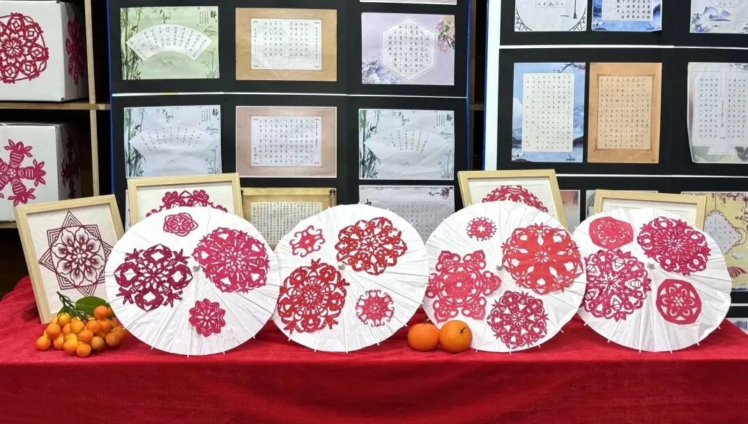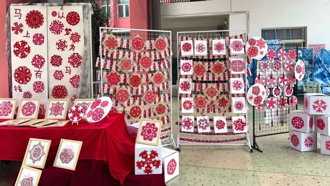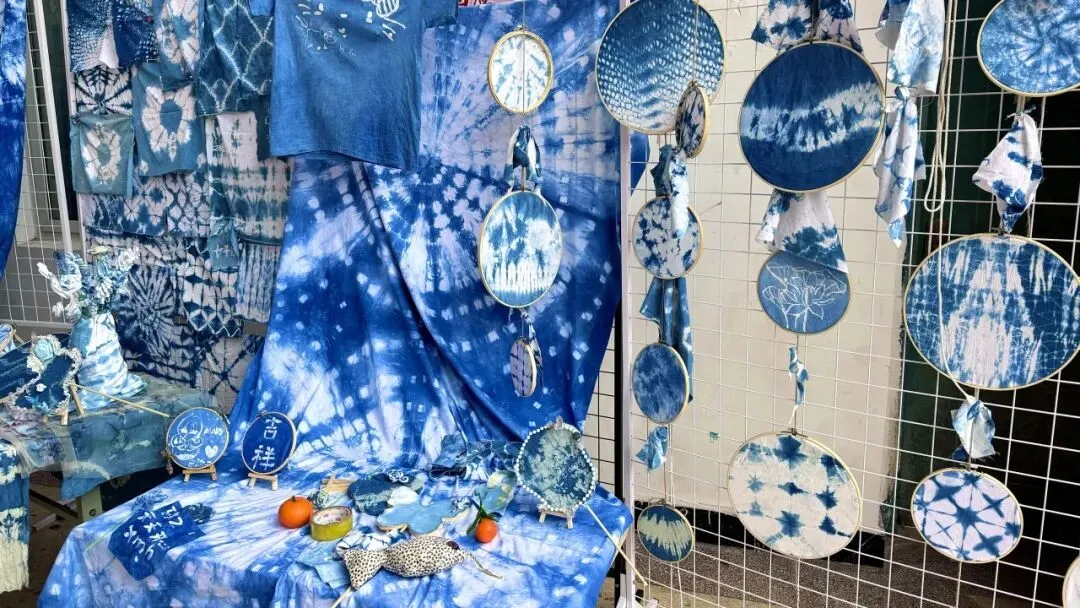 剪纸社与扎染社的同学们,以手为媒,以心传艺,让古老的非遗技艺在校园里续写新章。精巧的镂空凝结着手工的专注,斑斓的晕染浸透着时光的诗意。这些作品不仅静置于展架,更垂悬于中式纱幔之间,随风轻漾,为整个展览勾勒出一幅可触摸的、流动的传统画卷。