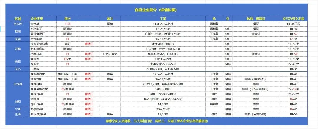 【地址】:开福区夸特纳斯(中青路附近)2025/12/15日开始入职的计件人员(指从未入职过的新员工)打包员和分拣员实行保底一个月薪资模式。①打包员:负责蔬菜水果的上货,过秤,打包,装框,贴标等工作内容,4女2男一个小组。女生负责打包过秤,男生负责上货,装框等。从入职日开始核算一个月,薪资以每天170元标准核算(要求当天打包计件产量不低于500单,且当天工时>8小时以上,且有完整上下班打卡记录),保底薪资170*30=5100元(附加一个月内不能以离职和提离职状态,以离职的均按计件工资计件算)。工作时间11:00-23:00左右②分拣员:负责油米水等商品的走动式分拣工作。从入职日开始核算一个月,薪资以每天200元标准核算(要求当天分拣计件产量不低于80元。且当天工时>8小时,且有完整上下班打卡记录)保底薪资200*30=6000元(附加一个月内不能以离职和提离职状态,以离职的均按计件工资计算)。③库维专员:负责商品的转运和盘点数量等工作,当月出勤满200小时按18结算,当月出勤未满200小时按16结算。库维专员要求必须做到2月14以及今月初六返岗(2月22)工作时间:14:00-02:00左右以上所有岗位出勤满7天以后,每周均可预支500生活费。面试时间:周一至周六15:30-16:00(过时不候)出勤未满3天🈚️薪资结算(离职均需提前30天写离职单)【工作内容】:母婴用品打包,分类,拣货(工作简单,不会有人教)【工作时间】:08:30—20:30(需要配合加班,月休四天,多劳多得)【工作要求】:17~45 岁,男女不限,身体健康,无传染性疾病!【工资待遇】:15/h+0~3/h绩效考核;综合工资4500-5500元(外加260-780元计件绩效),商保80每月,包住,包工作餐(15 号发上个月工资)【温馨提示】:需要能做满三个月以上(否则最后一个月12元每小时),每个星期可以预支300元(不收抽烟人员)【招聘要求】女生18-35,有过销售经验,会普通话和简单的电脑操作,愿意学习,接受打电话。【工作内容】负责公司广告进线客户的讲解,达成销售,公司每天充足资源分配,不需要打陌拜电话。【工作时间】上班时间8小时,两班倒(9-18、15-22)。月休四天(自由调休),【薪资待遇】底薪+提成+=综合薪资8k以上不封顶+不定期下午茶+生日福利+节日福利,包住宿包吃两顿(中+晚)衡阳顺丰开招啦,工期35天管理人性化,全国最轻松电商仓,做事简单轻松主要负责在电商件的分拣,扫描,装车,卸车,码货,拉包,等,做事简单轻松工资待遇:15+1元稳岗补贴(需做到2.14号统一发放)工作要求:男性,年龄18到52岁,无案底,做满35天结清所有工资🍄星沙维胜科技正式工/小时工(小时工暂停,长期工继续)岗位要求:男女不限,年龄22-42岁,需两班倒,男生基本都是站班正式工:底薪2000+加班工资+餐补260元+晚班补贴8元/次+岗位补贴0-800元+高温补贴300+绩效0-600元+全勤奖100元+入职买五险转正买一金+带薪休假,综合薪资5000-6500元小时工:17/h(基本工资+绩效)+岗位津贴+超产奖,综合薪资4500-5500,食宿情况:入职就发餐补,免费宿舍,宿舍离厂区3分钟,体检费第一次工资中报销面试时间:正式工上午9-10,小时工下午1:30-2:30工作内容:园区巡查岗位要求:18-50岁男性,无纹身染发,无犯罪记录,身心健康,身高165以上,必须能接受跨年上班2.16-2.18三天,接受寒假工,寒假工需要能做到正月十五薪资待遇:白班3200+300节假日补贴,晚班3200+300节假日补贴上班时间:7.30-7.30,白晚班可以自由选择食宿情况:包吃包住 白班包两餐,晚班包一餐,节假日补贴做满跨年三天才有面试时间:工作日 下午13.30-17.00面试地址:财富港湾1栋2单元1811🍄星沙安瑞电器长白班+不用体检岗位:线束组装、整理、装插头、裁线分线,站班要求:女18-46岁,男18-40岁,无色盲色弱,视力良好,女生无需经验,男生要求有汽配厂经验高中或者中专学历,做正式工培养薪资:16元/时(15+1稳岗)择优转正买社保食宿:包吃工作餐两餐,女生不包住,100元/月住宿补贴,男生有宿舍包住时间:长白班8-20点,月休2-5天地址:和祥科技园南门面试时间:周一~周六上午10.00-11.00💰工资:16元/时(第一个月未满月按15元/时发薪) 第二个月开始计件多劳多得综合月薪5000~8000元食宿:包工作餐,包住宿4~6人间(水电费平摊)空调、洗衣机都有🍄明天开始龙峰地铁站附近电商仓库短期工,至少做到2月10号面试简单,愿意做当天安排住宿, 免体检 每周可预支 面试时间(‼️请告知求职者按时到达,超时将无法面试)一类岗:17.5元|满174小时以外的19.5/小时+绩效奖0-200二类岗:19.5元|满174小时以外的21.5/小时+绩效奖0-200三类岗:21.5元|满174小时以外的23.5/小时+绩效奖0-200年纪:20-42岁男女不限,优秀可以放宽至45入职需体检 薪资待遇:17元每小时,(其中1元每小时稳岗补贴,发薪日在职有补贴!)地址:湖南固尔邦幕墙装饰股份有限公司(湖南省长沙市长沙县枫树路307号)长期工薪资:计时保护期为1个月,第二个月开始个人计件。计时工资为15+1第一个月未满月的按15进行发放8:30-18:00(根据订单确定下班时间、需配合加班)面试时间:周一到周五下午15:00点准时面试 (过时不候)可长期做!手工活!【工作要求】 男女不限,17-50 岁(有经验的可以放宽),要吃苦耐劳,打酱油的不要,身体健康。【工作时间】08:30-18:30 中午休息一个小时。高峰期可能会加班到9点。【薪资待遇】包住,不包吃(园区有食堂8-10元/餐)可预支(纯计件)旺季7000-10000 元➕/月淡季5000-7000 元/月下半年旺季!长期有活!【地址】长沙县致远农业物流园🍄工资上涨!!长沙县食品厂年前