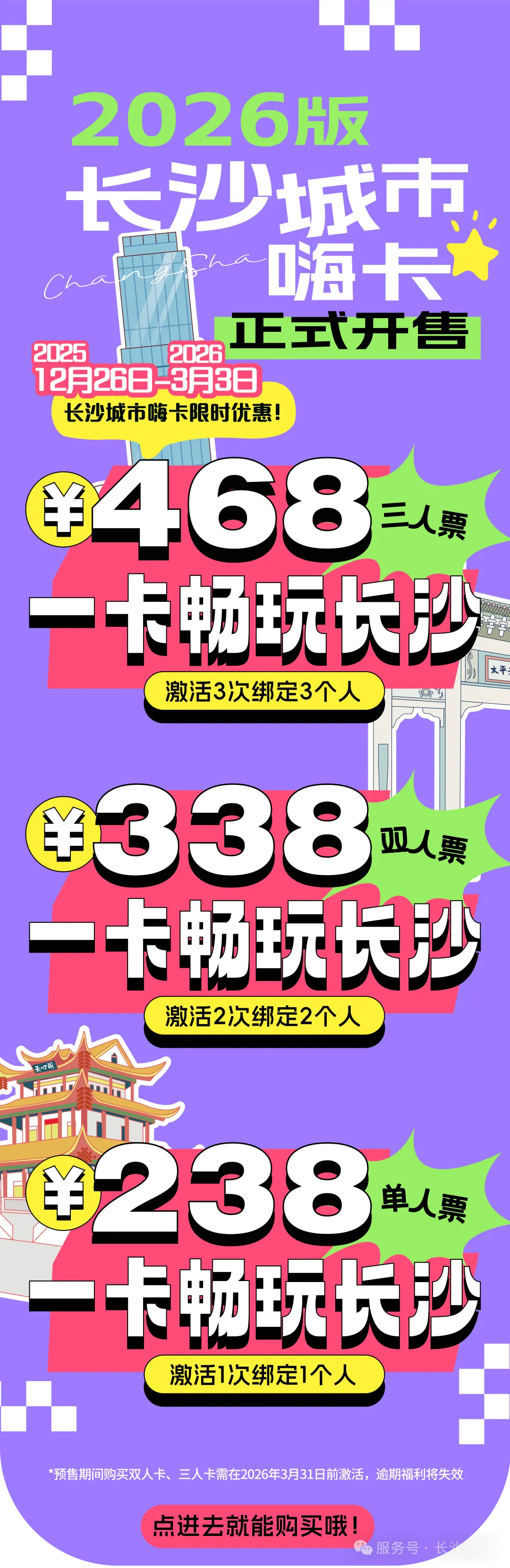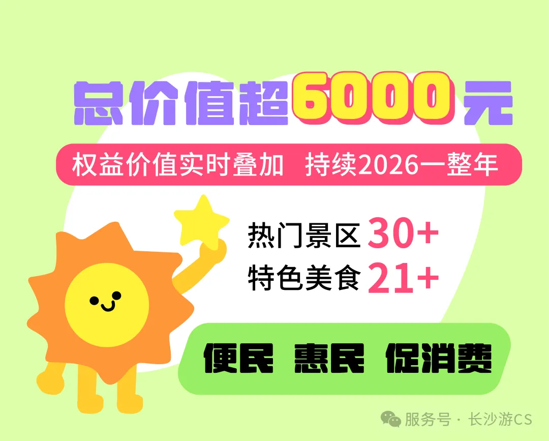 2026版长沙城市嗨卡正式开售,宝子们可以在周末时光里自由徜徉于各大景区之间,自然山水到国风穿越,从亲子乐园到都市潮玩,深度解锁星城的千面风情。